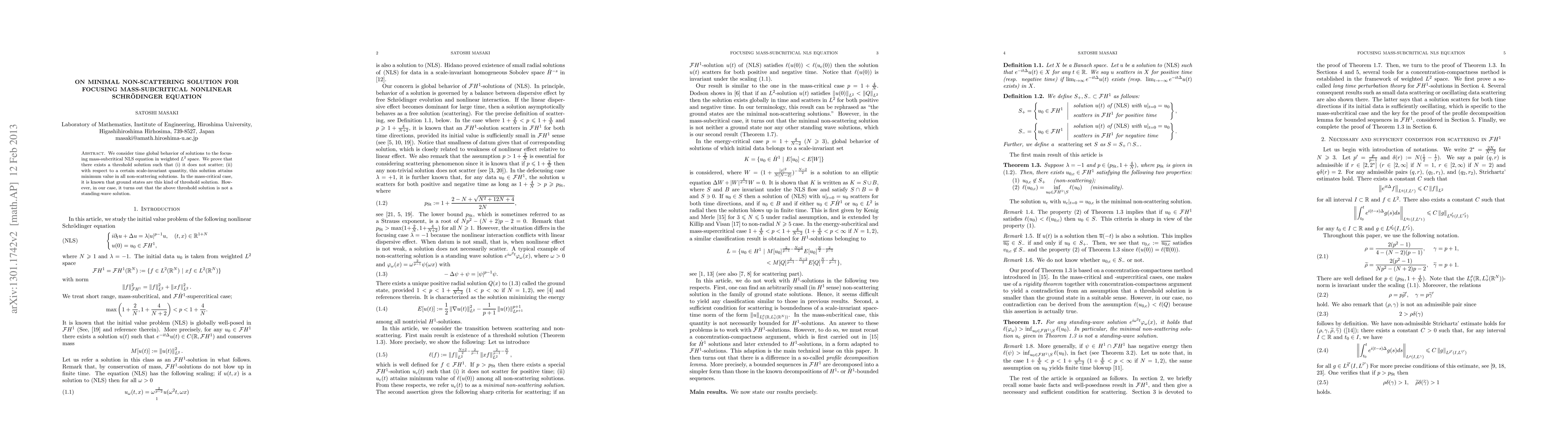 This paper investigates the global behavior of solutions to the focusing mass-subcritical nonlinear Schrödinger equation, proving the existence of a minimal non-scattering threshold solution that does not scatter and attains the minimum value of a certain scale-invariant quantity among all non-scattering solutions. Unlike the mass-critical case, this solution is not a standing wave.
