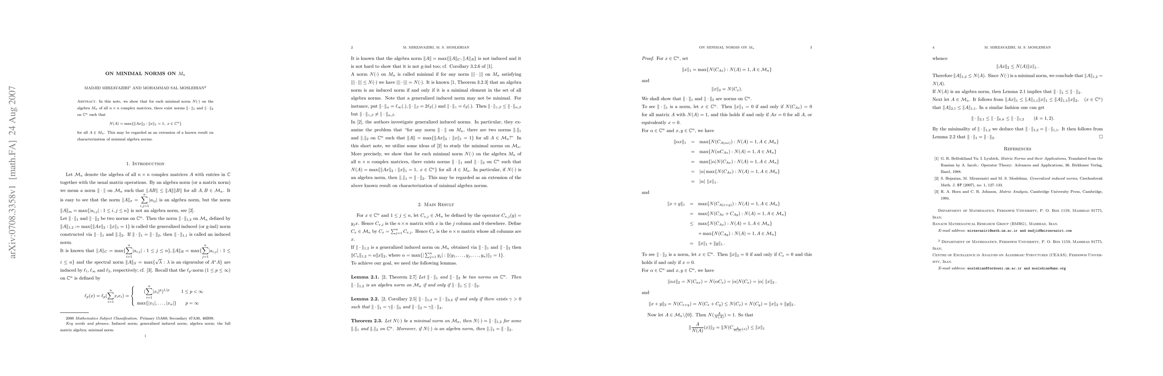 The paper shows that for every minimal norm on the algebra of $n imes n$ complex matrices, there exist norms $rac{1}{2}$-norm and 2-norm on ${oldsymbol{ heta}}^n$ that satisfy a specific inequality condition. This result extends a known characterization of minimal algebra norms.