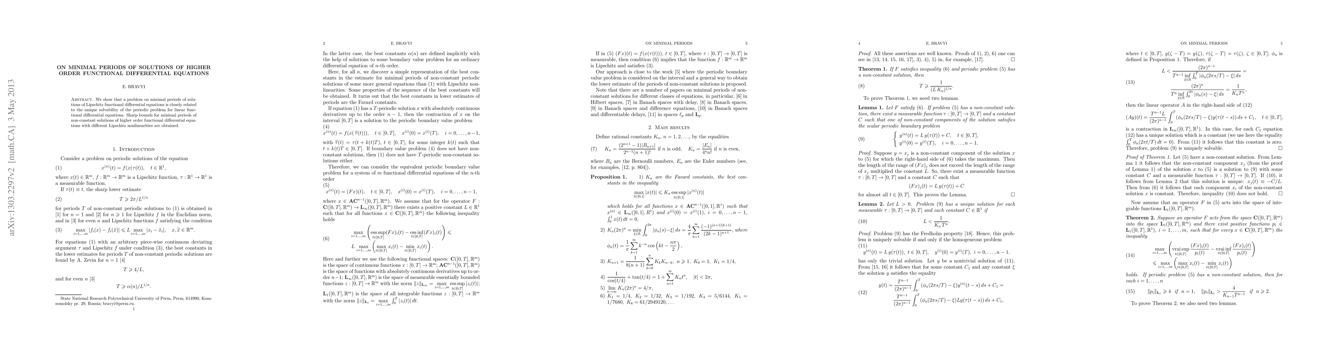 This paper investigates the minimal periods of solutions for higher order Lipschitz functional differential equations, establishing their connection to the unique solvability of periodic problems for linear functional differential equations and deriving sharp bounds for these minimal periods.