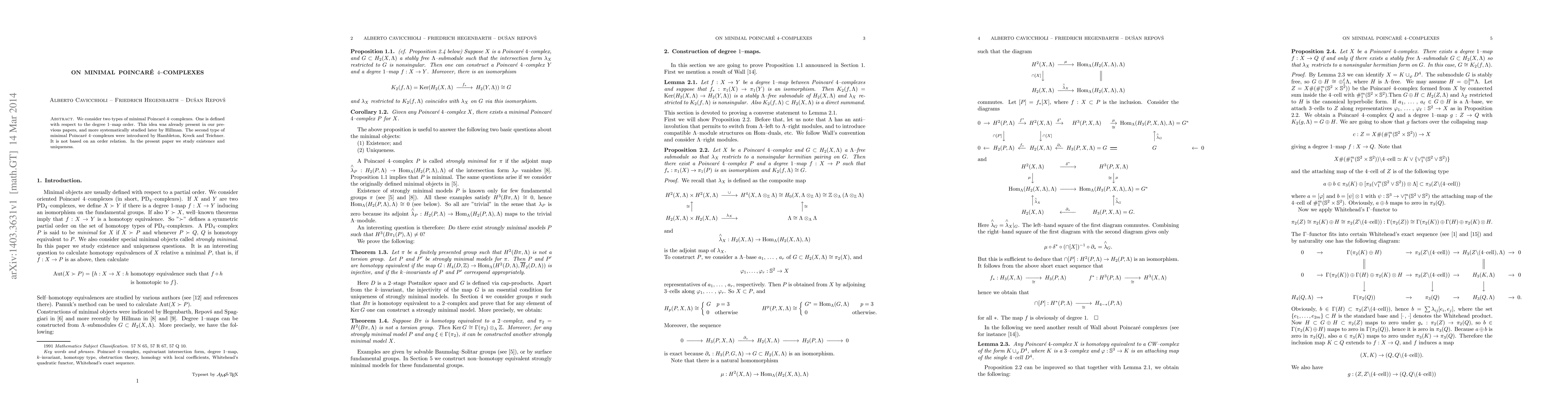 We consider two types of minimal Poincar\'e $4$-complexes. One is defined with respect to the degree $1$-map order. This idea was already present in our previous papers, and more systematically studied later by Hillman. The second type of minimal Poincar\'e $4$-complexes were introduced by Hambleton, Kreck and Teichner. It is not based on an order relation. In the present paper we study existence and uniqueness.
