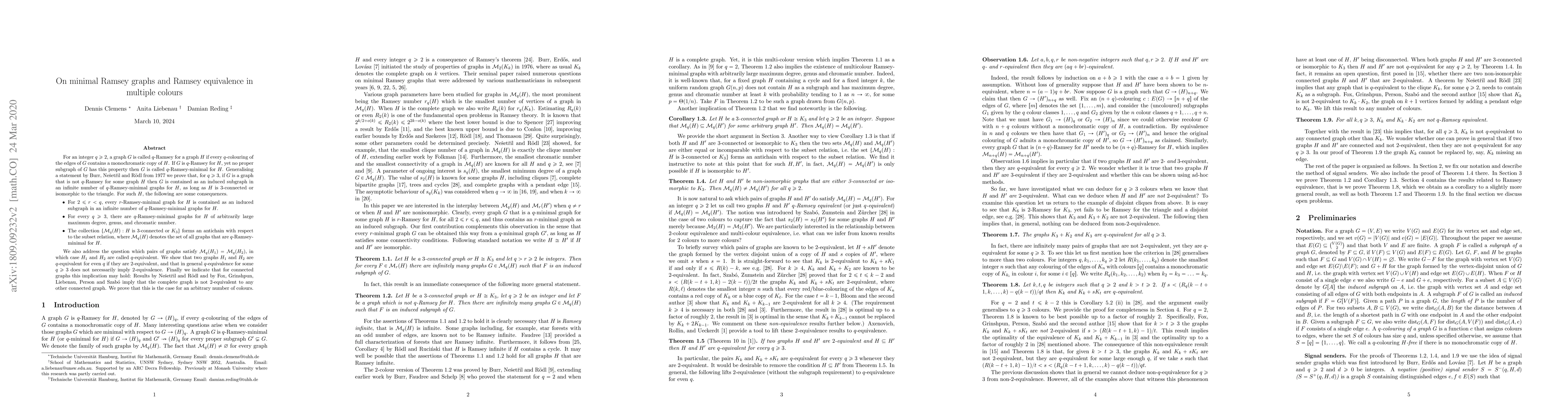 This paper explores minimal Ramsey graphs and Ramsey equivalence in multiple colours, proving that non-$q$-Ramsey graphs are contained in infinitely many $q$-Ramsey-minimal graphs for specific $H$ when $q\ge 3$. It also discusses the implications of $q$-equivalence between graphs and concludes that the complete graph cannot be $2$-equivalent to any other connected graph for any number of colours.