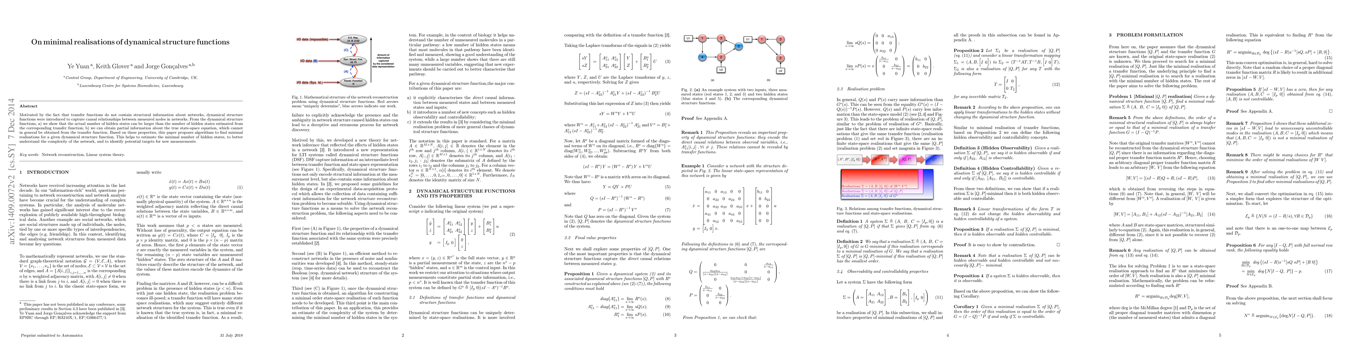 Motivated by the fact that transfer functions do not contain structural information about networks, dynamical structure functions were introduced to capture causal relationships between measured nodes in networks. From the dynamical structure functions, a) we show that the actual number of hidden states can be larger than the number of hidden states estimated from the corresponding transfer function; b) we can obtain partial information about the true state-space equation, which cannot in general be obtained from the transfer function. Based on these properties, this paper proposes algorithms to find minimal realisations for a given dynamical structure function. This helps to estimate the minimal number of hidden states, to better understand the complexity of the network, and to identify potential targets for new measurements.