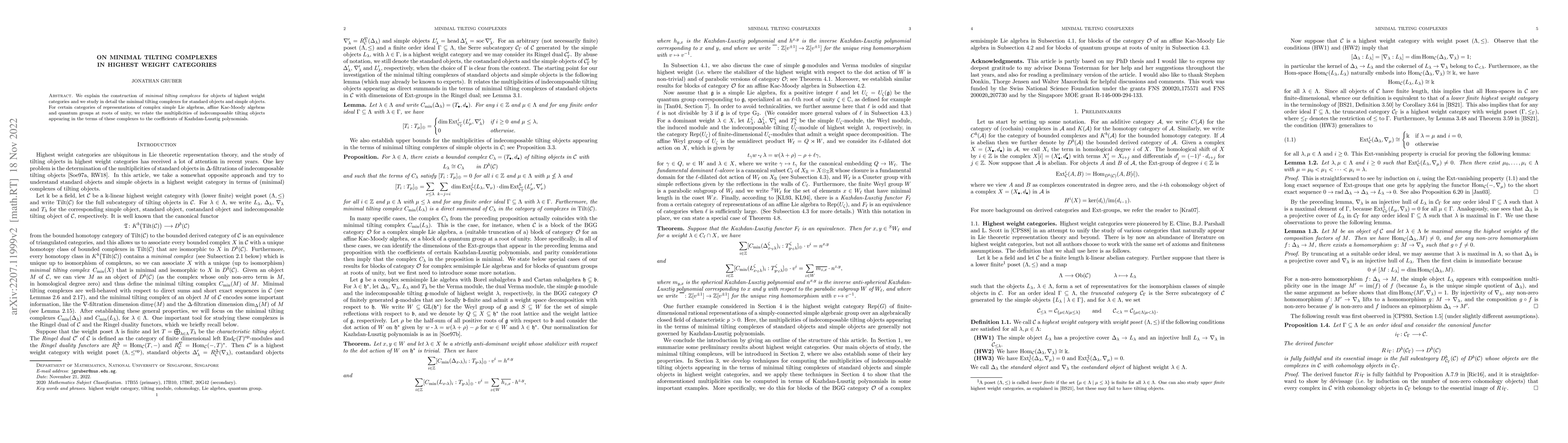 This paper constructs minimal tilting complexes for objects in highest weight categories and analyzes their structure for standard and simple objects. It connects the multiplicities of indecomposable tilting objects in these complexes to the coefficients of Kazhdan-Lusztig polynomials in specific representation categories.