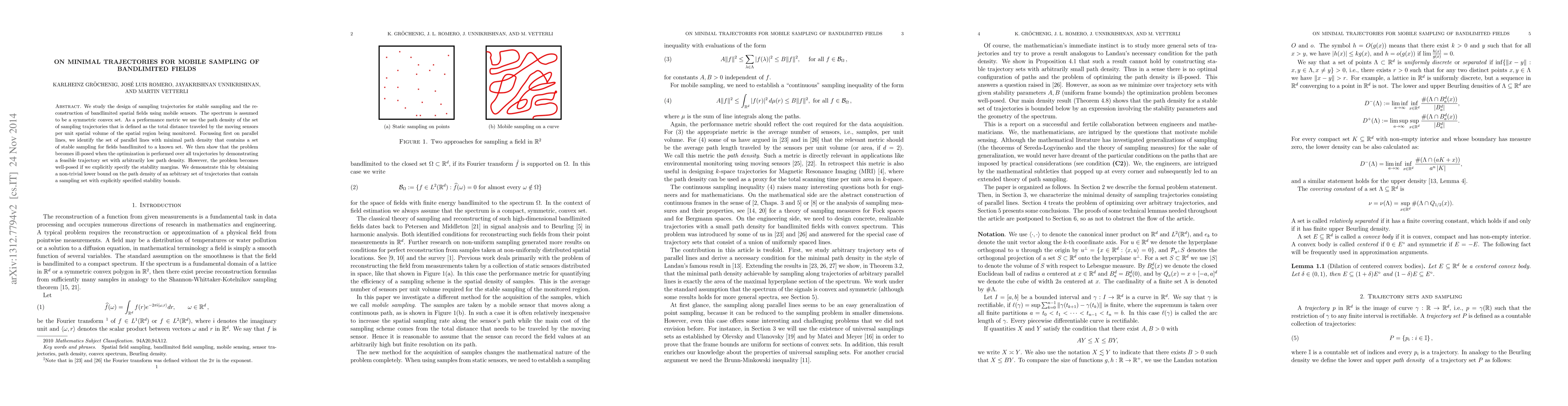 This paper explores optimal sampling trajectories for mobile sensors to reconstruct bandlimited spatial fields, focusing on minimizing path density. It identifies parallel lines with minimal path density for stable sampling but shows the problem becomes ill-posed without specified stability margins, resolving it by establishing a lower bound on path density with explicit stability constraints.