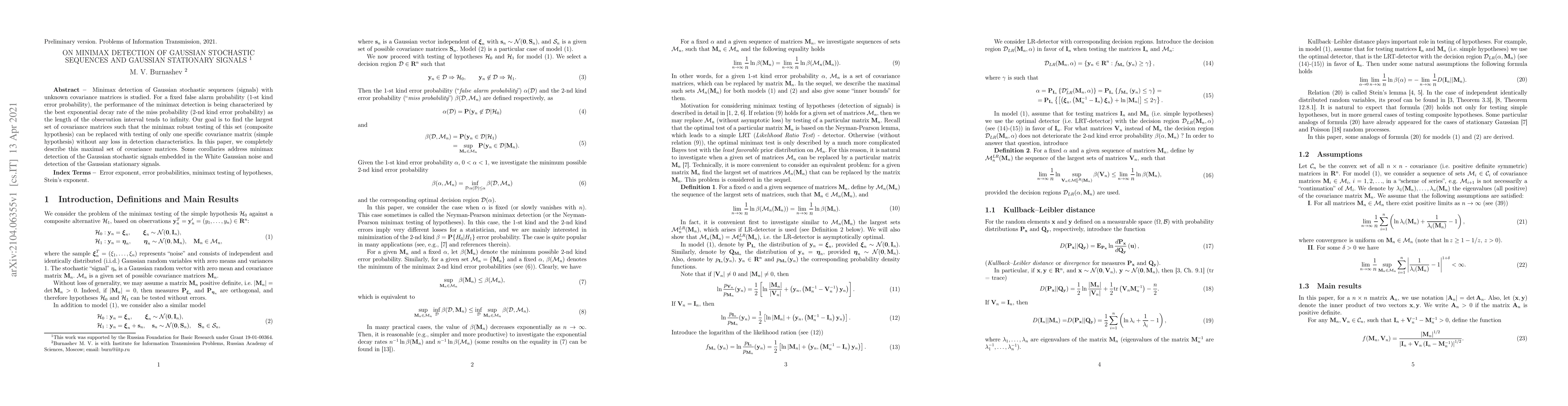 This paper investigates the optimal detection of Gaussian stochastic sequences and stationary signals under unknown covariance matrices, focusing on the minimax detection criteria. It identifies the largest set of covariance matrices where robust testing can be simplified without compromising detection performance.