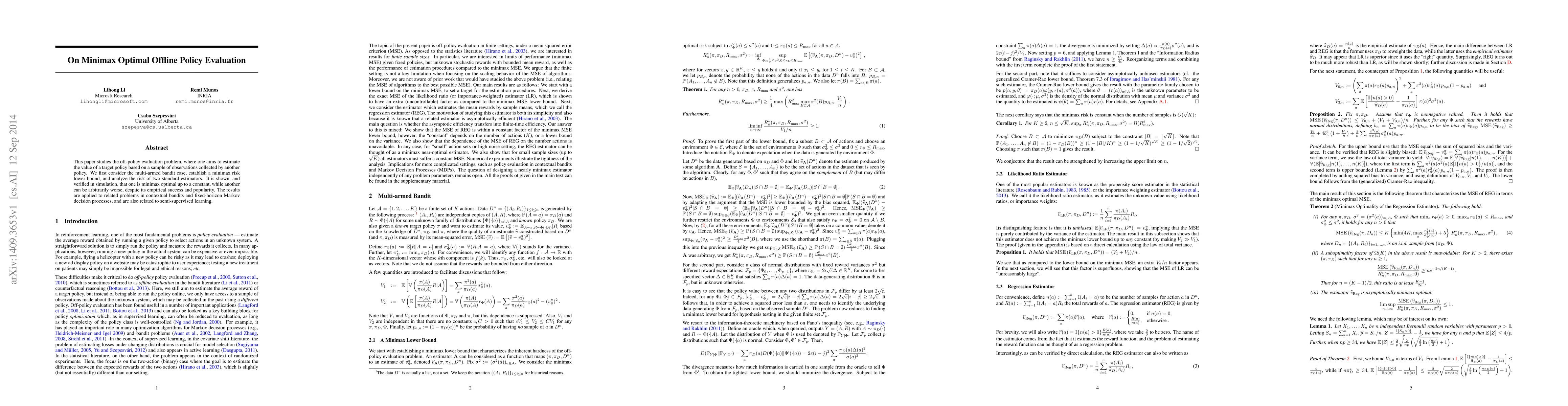 This paper investigates the off-policy evaluation problem, establishing a minimax risk lower bound for the multi-armed bandit case and analyzing two estimators, showing one is minimax optimal while the other can perform poorly. The findings extend to contextual bandits and fixed-horizon Markov decision processes, with connections to semi-supervised learning.