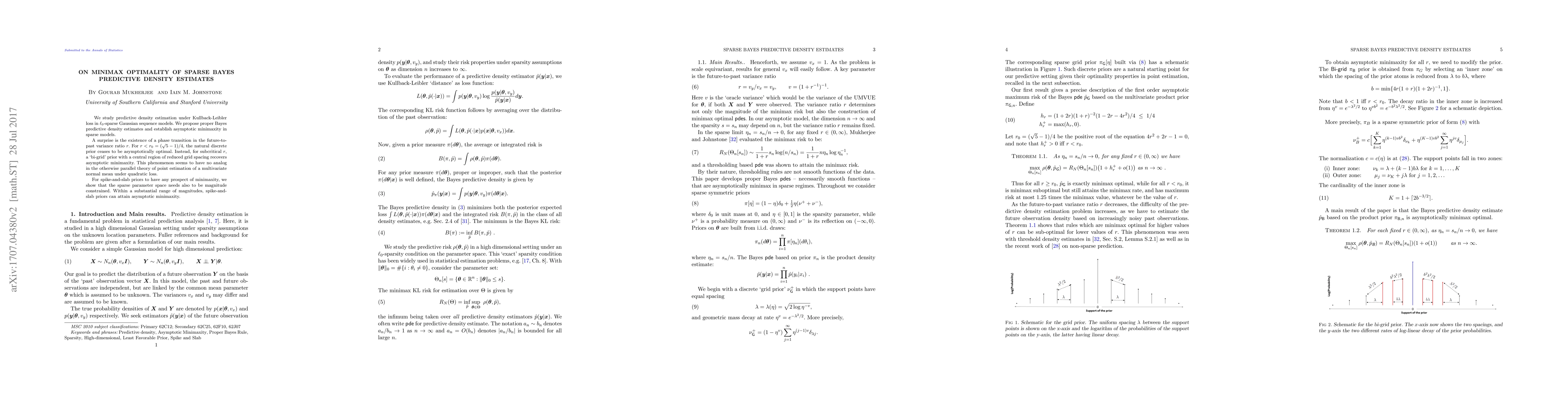 We study predictive density estimation under Kullback-Leibler loss in $\ell_0$-sparse Gaussian sequence models. We propose proper Bayes predictive density estimates and establish asymptotic minimaxity in sparse models. A surprise is the existence of a phase transition in the future-to-past variance ratio $r$. For $r < r_0 = (\surd 5 - 1)/4$, the natural discrete prior ceases to be asymptotically optimal. Instead, for subcritical $r$, a `bi-grid' prior with a central region of reduced grid spacing recovers asymptotic minimaxity. This phenomenon seems to have no analog in the otherwise parallel theory of point estimation of a multivariate normal mean under quadratic loss. For spike-and-slab priors to have any prospect of minimaxity, we show that the sparse parameter space needs also to be magnitude constrained. Within a substantial range of magnitudes, spike-and-slab priors can attain asymptotic minimaxity.
