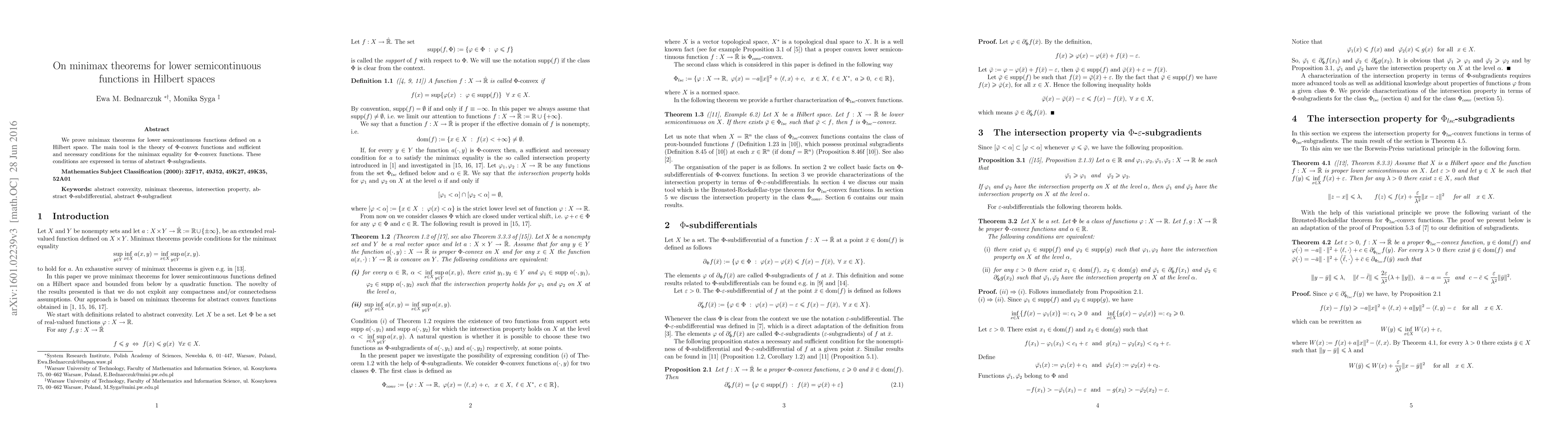 This paper proves minimax theorems for lower semicontinuous functions in Hilbert spaces using $\Phi$-convexity and abstract $\Phi$-subgradients, establishing sufficient and necessary conditions for the minimax equality to hold.