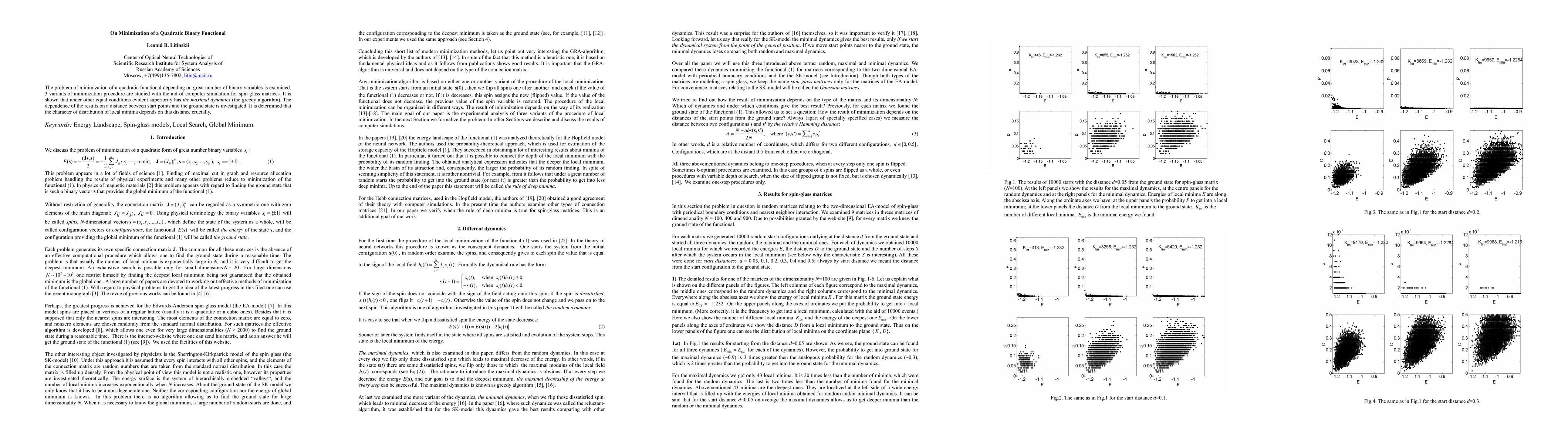 The problem of minimization of a quadratic functional depending on great number of binary variables is examined. 3 variants of minimization procedure are studied with the aid of computer simulation for spin-glass matrices. It is shown that under other equal conditions evident superiority has the maximal dynamics (the greedy algorithm). The dependence of the results on a distance between start points and the ground state is investigated. It is determined that the character of distribution of local minima depends on this distance crucially.
