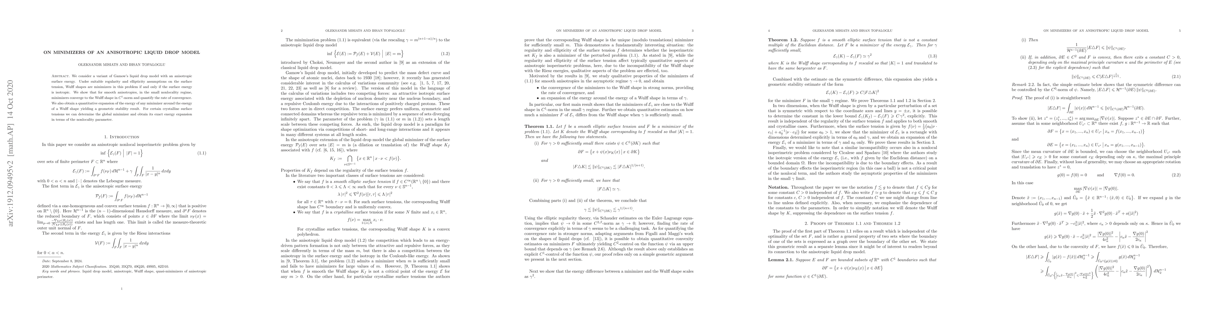 This paper investigates anisotropic variants of Gamow's liquid drop model, proving that Wulff shapes are minimizers only when surface energy is isotropic. It demonstrates that for small nonlocality, minimizers converge to the Wulff shape in $C^1$-norm and provides a quantitative rate of convergence.