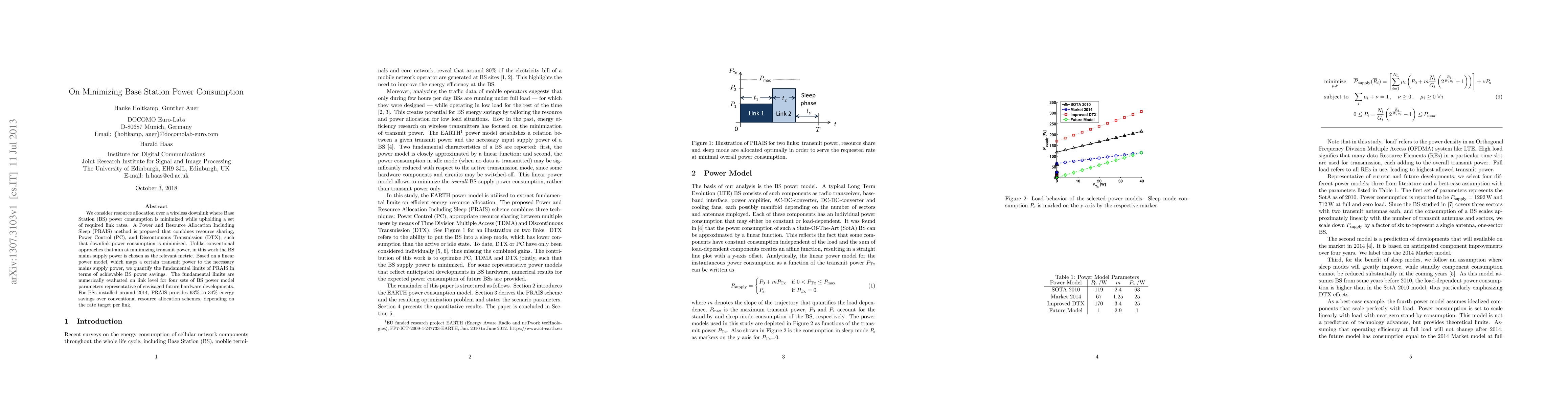 This paper proposes a PRAIS method to minimize Base Station (BS) power consumption by combining resource sharing, Power Control, and Discontinuous Transmission. It establishes fundamental limits for achievable power savings, showing a 61% to 34% gain over conventional methods, depending on the load per link.
