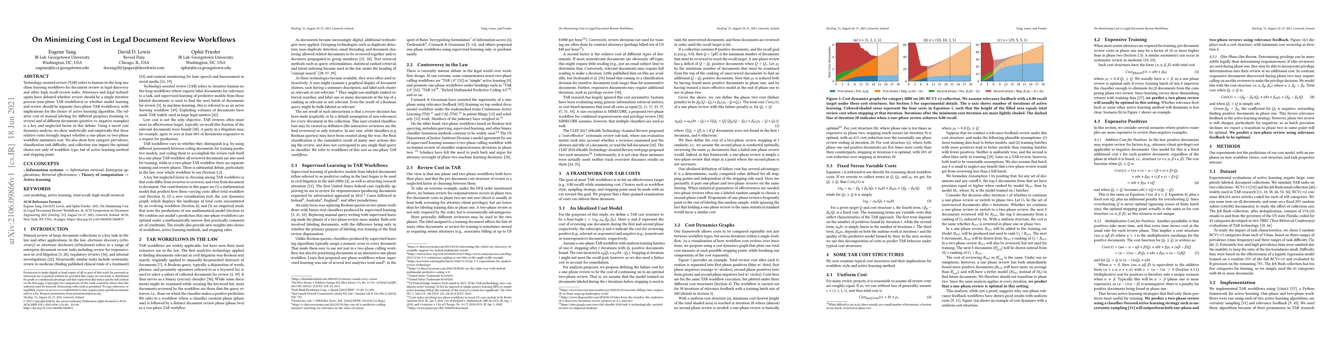 This paper explores the cost dynamics of technology-assisted review (TAR) workflows in legal document review, comparing one-phase and two-phase approaches. It concludes that relative costs of manual labeling and document types significantly influence cost minimization, with implications for active learning algorithms and workflow design.