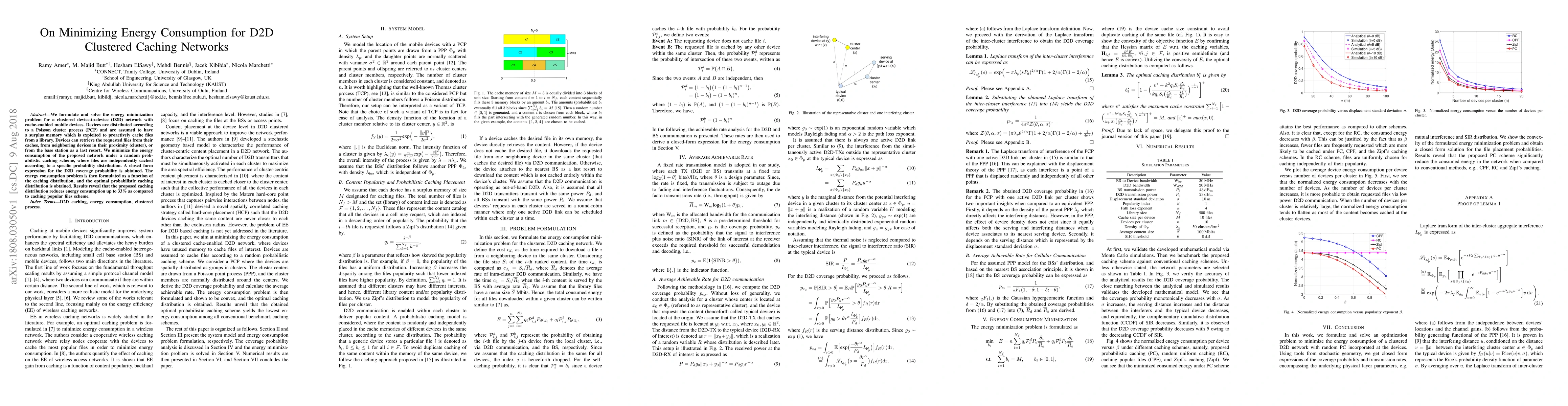 This paper formulates and solves an energy minimization problem for clustered device-to-device (D2D) networks with cache-enabled mobile devices. The optimal probabilistic caching distribution is derived to reduce energy consumption by up to 33% compared to caching popular files, leveraging a random probabilistic caching scheme.