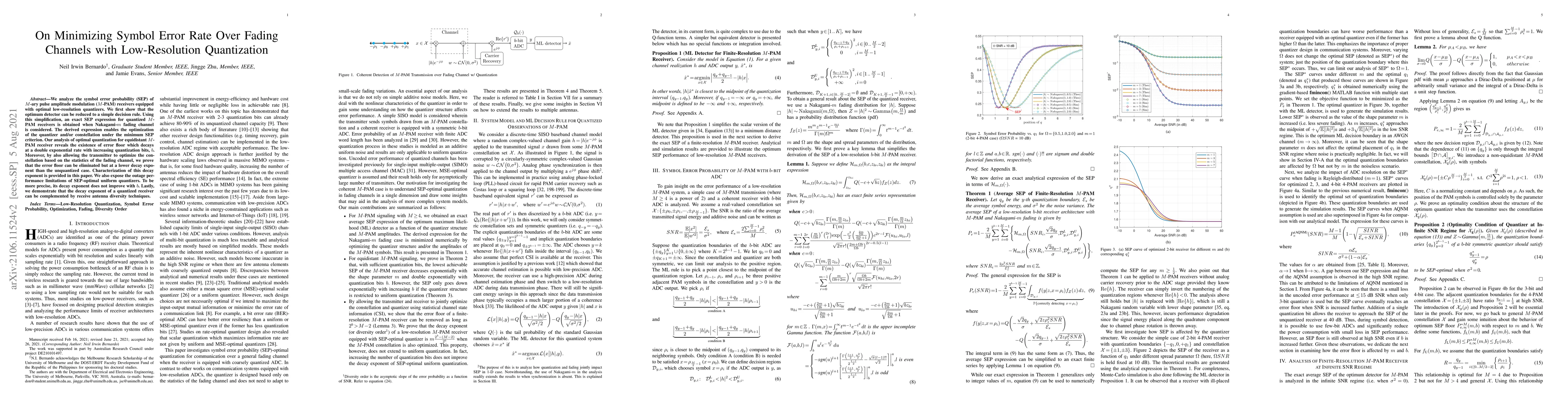 We analyze the symbol error probability (SEP) of $M$-ary pulse amplitude modulation ($M$-PAM) receivers equipped with optimal low-resolution quantizers. We first show that the optimum detector can be reduced to a simple decision rule. Using this simplification, an exact SEP expression for quantized $M$-PAM receivers is obtained when Nakagami-$m$ fading channel is considered. The derived expression enables the optimization of the quantizer and/or constellation under the minimum SEP criterion. Our analysis of optimal quantization for equidistant $M$-PAM receiver reveals the existence of error floor which decays at a double exponential rate with increasing quantization bits, $b$. Moreover, by also allowing the transmitter to optimize the constellation based on the statistics of the fading channel, we prove that the error floor can be eliminated but at a lower decay exponent than the unquantized case. Characterization of this decay exponent is provided in this paper. We also expose the outage performance limitations of SEP-optimal uniform quantizers. To be more precise, its decay exponent does not improve with $b$. Lastly, we demonstrate that the decay exponent of a quantized receiver can be complemented by receive antenna diversity techniques.