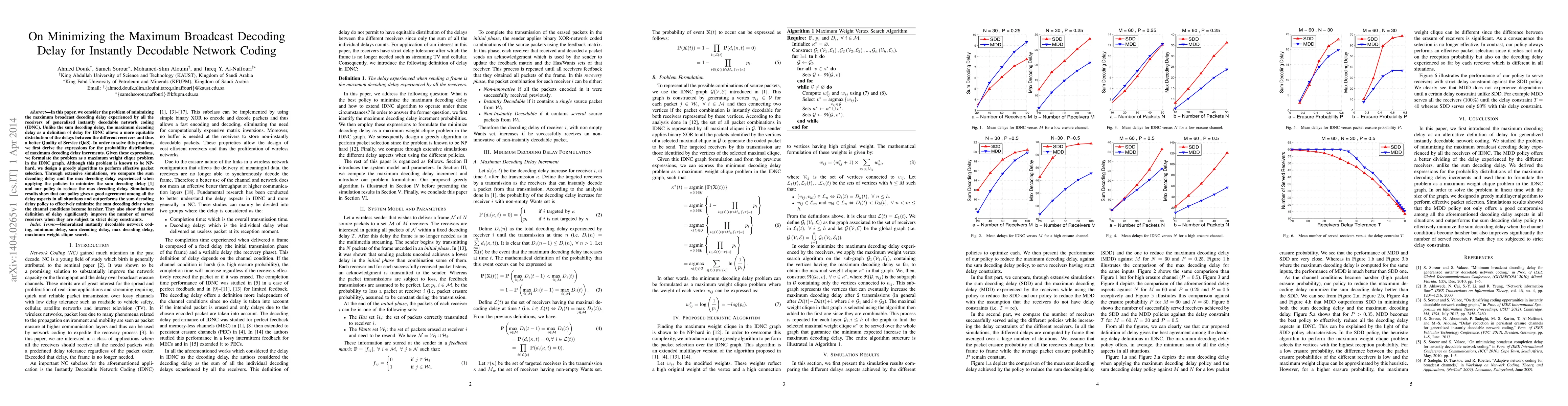 A novel approach to minimizing maximum broadcast decoding delay is presented, which takes into account both reception probability and decoding delay experienced by each receiver.