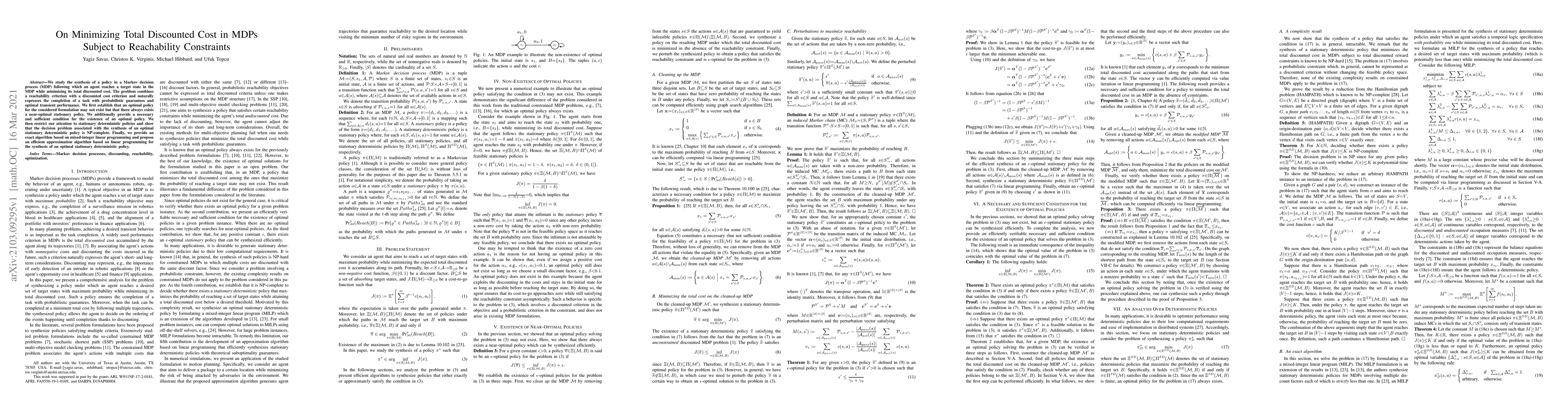 This paper investigates the synthesis of policies in Markov decision processes (MDPs) that minimize total discounted cost while ensuring a target state is reached. It establishes the existence of near-optimal stationary policies and provides an exact algorithm and an efficient approximation algorithm for synthesizing optimal stationary deterministic policies.
