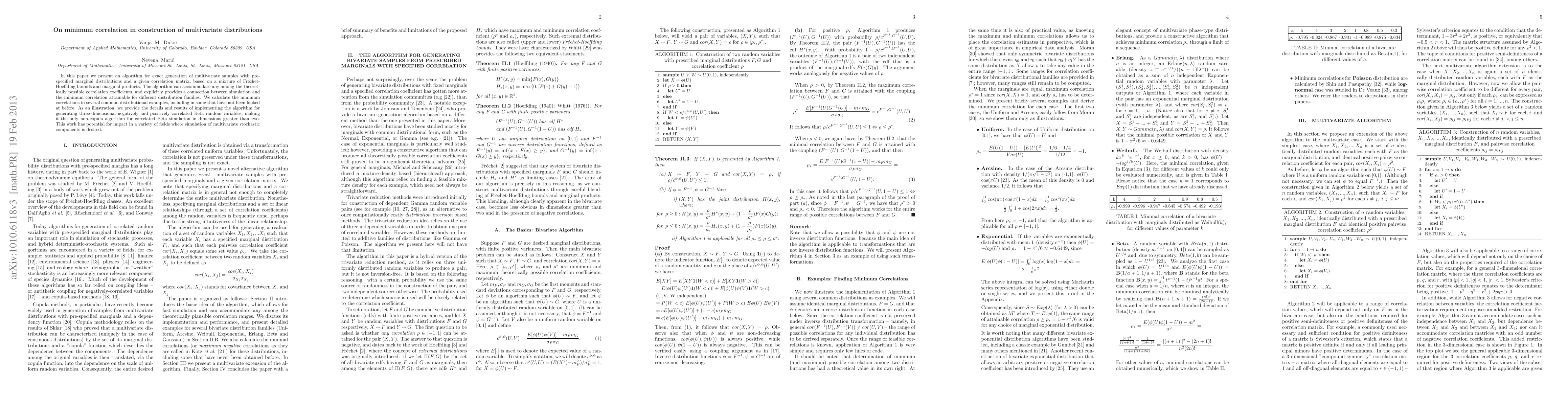 This paper introduces a method for generating multivariate samples with specified marginals and a given correlation matrix, using a mixture of Fr\'echet-Hoeffding bounds and marginal products. It calculates minimum correlations for various common distributions and demonstrates the algorithm with three-dimensional Beta variables, highlighting its potential in fields requiring multivariate stochastic simulations.