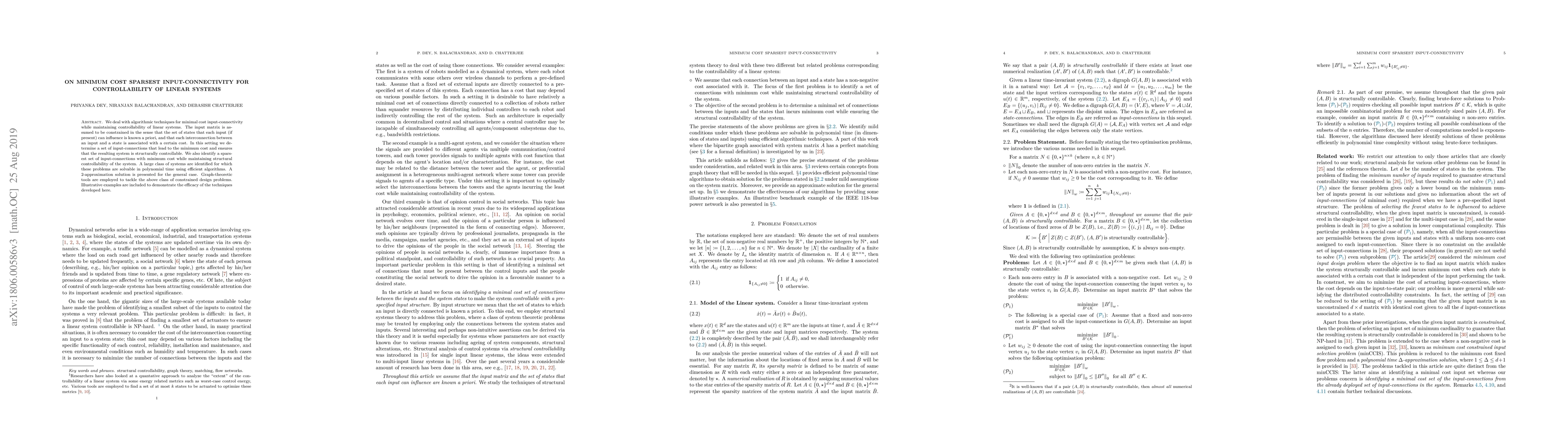 This paper develops algorithms for determining the minimum cost input-connectivity that maintains controllability in linear systems, focusing on sparse solutions. It presents efficient polynomial-time methods for specific systems and a 2-approximation algorithm for the general case, utilizing graph-theoretic tools and illustrated with examples.