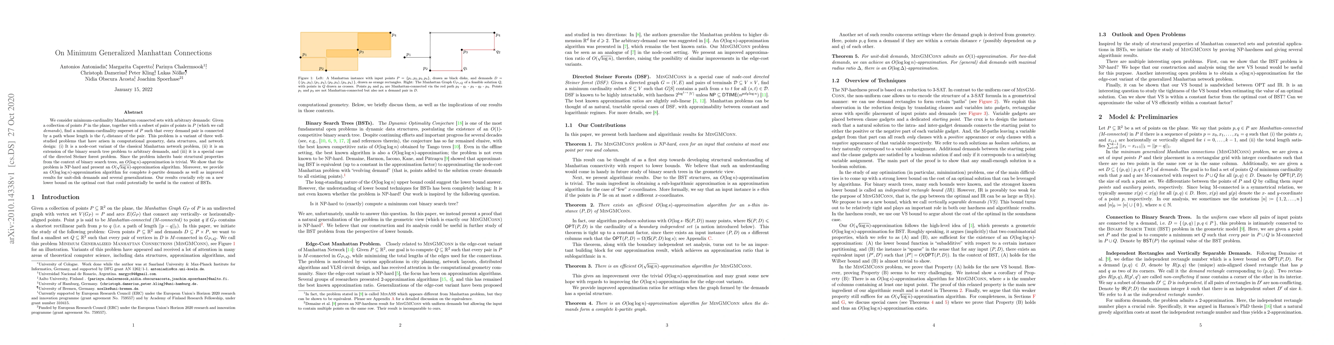 We consider minimum-cardinality Manhattan connected sets with arbitrary demands: Given a collection of points $P$ in the plane, together with a subset of pairs of points in $P$ (which we call demands), find a minimum-cardinality superset of $P$ such that every demand pair is connected by a path whose length is the $\ell_1$-distance of the pair. This problem is a variant of three well-studied problems that have arisen in computational geometry, data structures, and network design: (i) It is a node-cost variant of the classical Manhattan network problem, (ii) it is an extension of the binary search tree problem to arbitrary demands, and (iii) it is a special case of the directed Steiner forest problem. Since the problem inherits basic structural properties from the context of binary search trees, an $O(\log n)$-approximation is trivial. We show that the problem is NP-hard and present an $O(\sqrt{\log n})$-approximation algorithm. Moreover, we provide an $O(\log\log n)$-approximation algorithm for complete bipartite demands as well as improved results for unit-disk demands and several generalizations. Our results crucially rely on a new lower bound on the optimal cost that could potentially be useful in the context of BSTs.