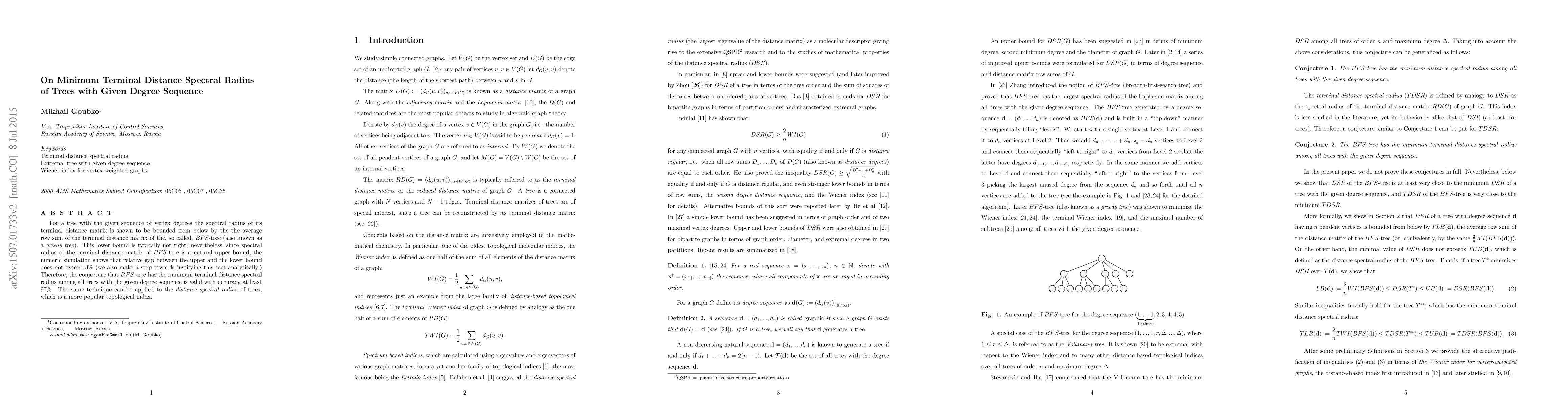 The research establishes a lower bound for the spectral radius of the terminal distance matrix in trees with a given degree sequence, showing it is at least the average row sum of the BFS-tree. The relative gap between this lower bound and the BFS-tree's spectral radius is confirmed to be less than 3%, supporting the conjecture that BFS-tree minimizes this spectral radius among such trees.