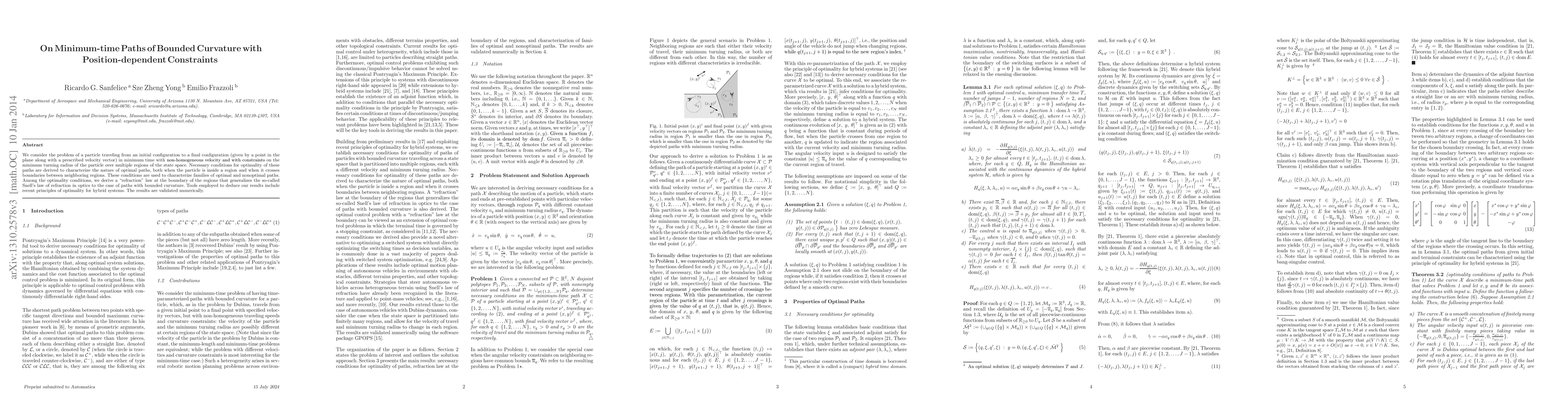 This paper derives conditions for minimum-time paths with bounded curvature under position-dependent constraints, including a generalization of Snell's law at boundaries between regions.