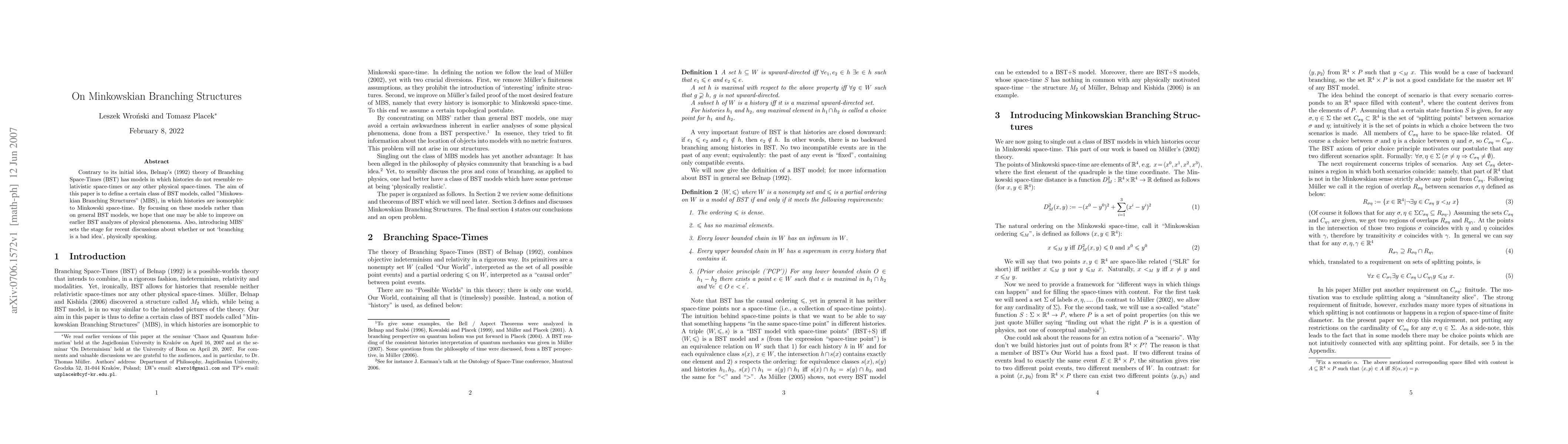 Contrary to its initial idea, Belnap's (1992) theory of Branching Space-Times (BST) has models in which histories do not resemble relativistic space-times or any other physical space-times. The aim of this paper is to define a certain class of BST models, called "Minkowskian Branching Structures" (MBS), in which histories are isomorphic to Minkowski space-time. By focusing on these models rather than on general BST models, we hope that one may be able to improve on earlier BST analyzes of physical phenomena. Also, introducing MBS' sets the stage for recent discussions about whether or not `branching is a bad idea', physically speaking.