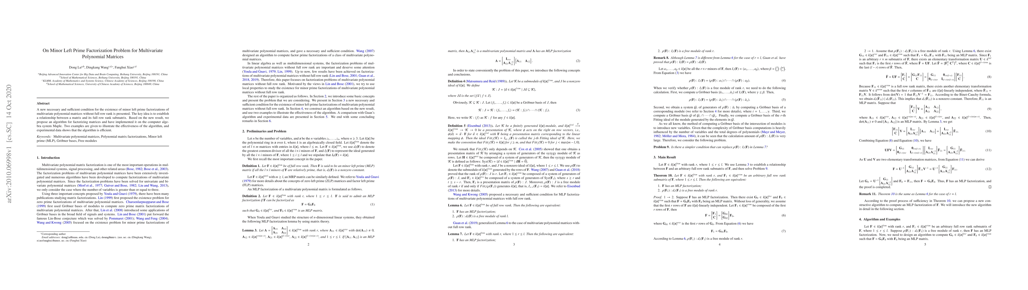 Summary: This paper introduces a new necessary and sufficient condition for the minor left prime factorization of multivariate polynomial matrices. An algorithm based on this condition is proposed and implemented in Maple, demonstrating its effectiveness and efficiency through examples.