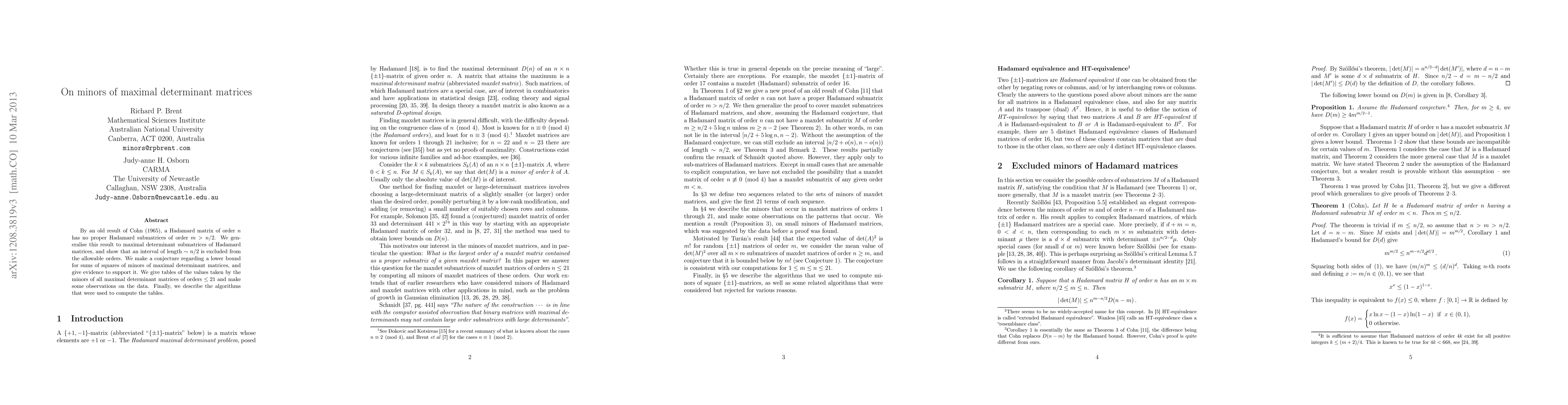 By an old result of Cohn (1965), a Hadamard matrix of order n has no proper Hadamard submatrices of order m > n/2. We generalise this result to maximal determinant submatrices of Hadamard matrices, and show that an interval of length asymptotically equal to n/2 is excluded from the allowable orders. We make a conjecture regarding a lower bound for sums of squares of minors of maximal determinant matrices, and give evidence in support of the conjecture. We give tables of the values taken by the minors of all maximal determinant matrices of orders up to and including 21 and make some observations on the data. Finally, we describe the algorithms that were used to compute the tables.