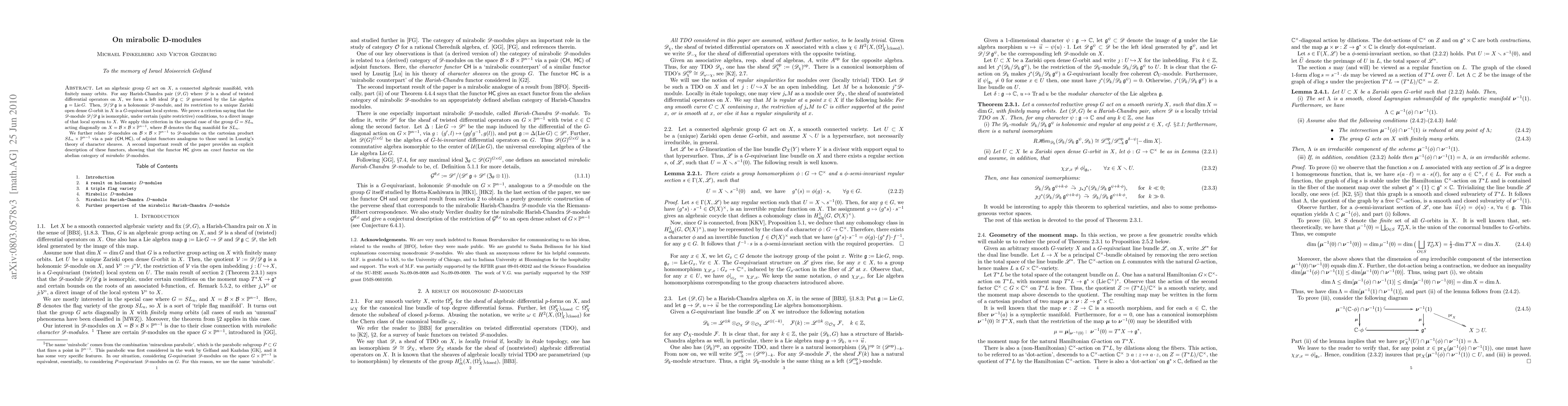 This paper investigates mirabolic D-modules associated with an algebraic group G acting on an algebraic manifold X with finitely many orbits. It establishes a criterion for the D-module D/D.g to correspond to a local system on a G-orbit, under restrictive conditions, and applies this to the case where G=SL(n) acts on F × F × P^{n-1}. The paper also describes adjoint functors CH and HC relating D-modules on F × F × P^{n-1} to those on SL(n) × P^{n-1}, showing HC as an exact functor on mirabolic D-modules.