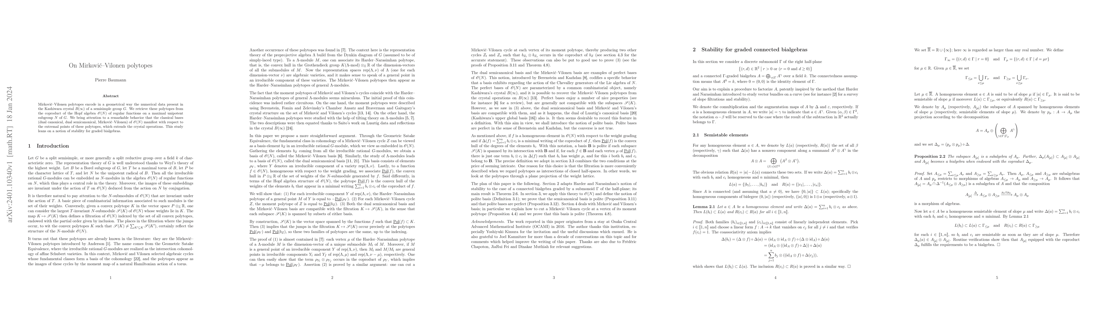 Mirkovi\'c-Vilonen polytopes geometrically encode data from the Kashiwara crystal $B(\infty)$ of a semisimple group $G$, derived from the coproduct of $\mathscr O(N)$. The classical bases of $\mathscr O(N)$ exhibit a unique relationship with the polytopes' extremal points, extending crystal operations, underpinned by stability notions for graded bialgebras.
