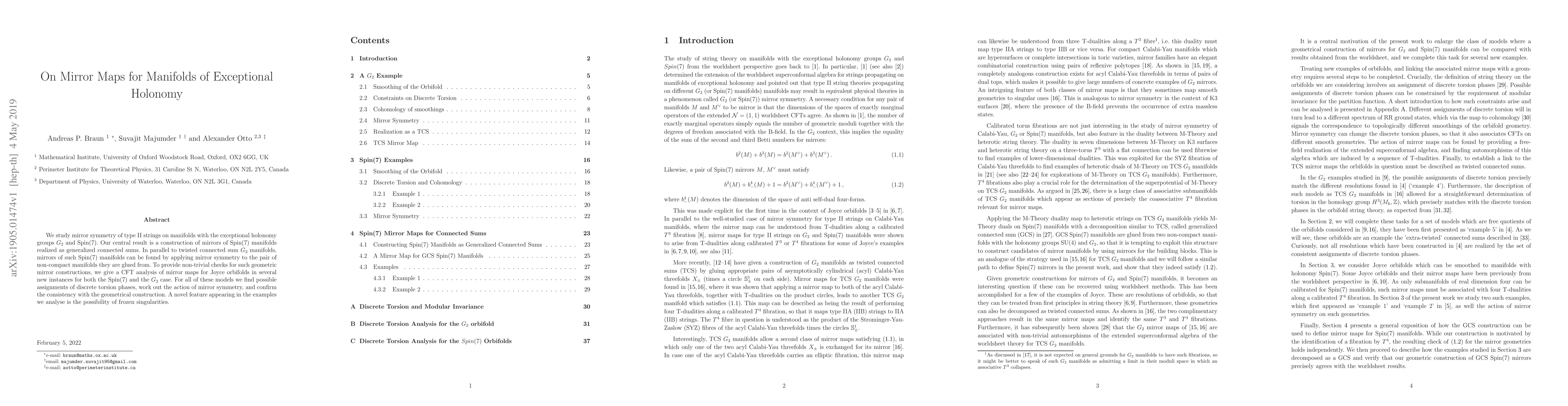 We study mirror symmetry of type II strings on manifolds with the exceptional holonomy groups $G_2$ and Spin(7). Our central result is a construction of mirrors of Spin(7) manifolds realized as generalized connected sums. In parallel to twisted connected sum $G_2$ manifolds, mirrors of such Spin(7) manifolds can be found by applying mirror symmetry to the pair of non-compact manifolds they are glued from. To provide non-trivial checks for such geometric mirror constructions, we give a CFT analysis of mirror maps for Joyce orbifolds in several new instances for both the Spin(7) and the $G_2$ case. For all of these models we find possible assignments of discrete torsion phases, work out the action of mirror symmetry, and confirm the consistency with the geometrical construction. A novel feature appearing in the examples we analyse is the possibility of frozen singularities.