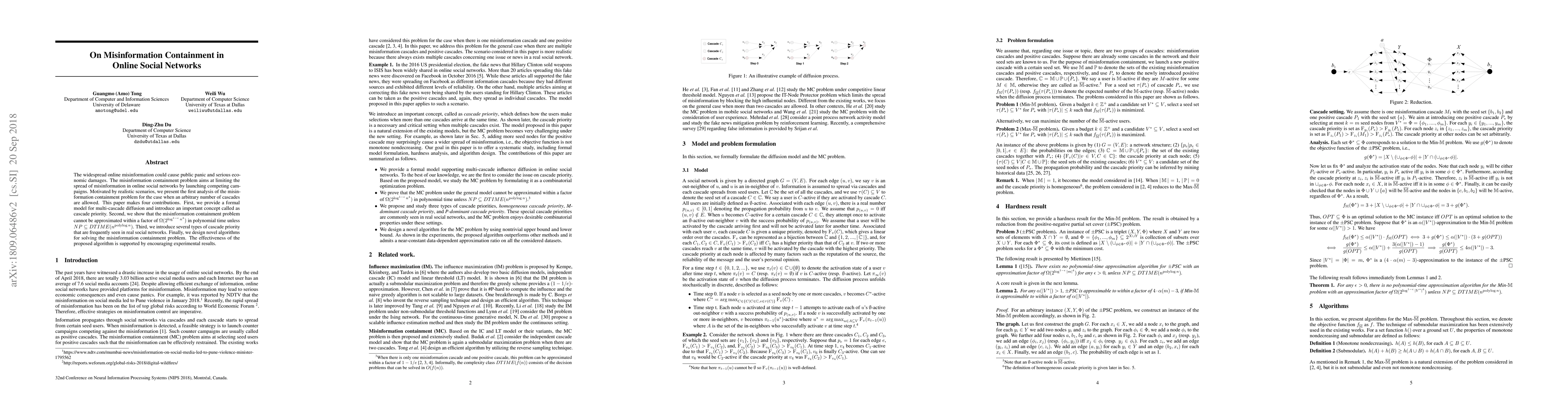 This paper presents a formal model for analyzing misinformation containment in online social networks, demonstrating the computational difficulty of the problem and introducing novel algorithms to tackle it. The study also highlights the importance of cascade priority in managing misinformation spread and provides encouraging experimental results for the proposed solutions.