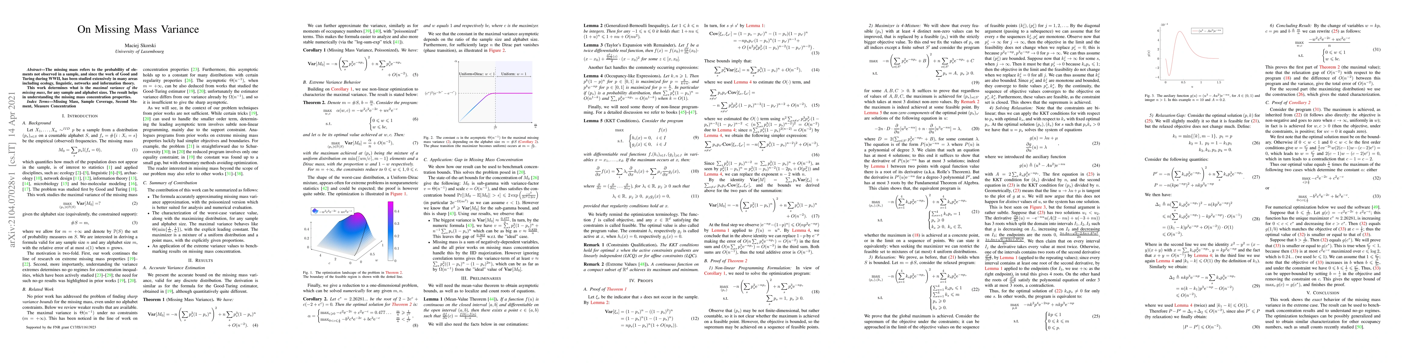This research determines the maximum variance of 'missing mass' - the probability of unobserved elements in a sample - across different sample and alphabet sizes, contributing to understanding concentration properties of missing mass.
