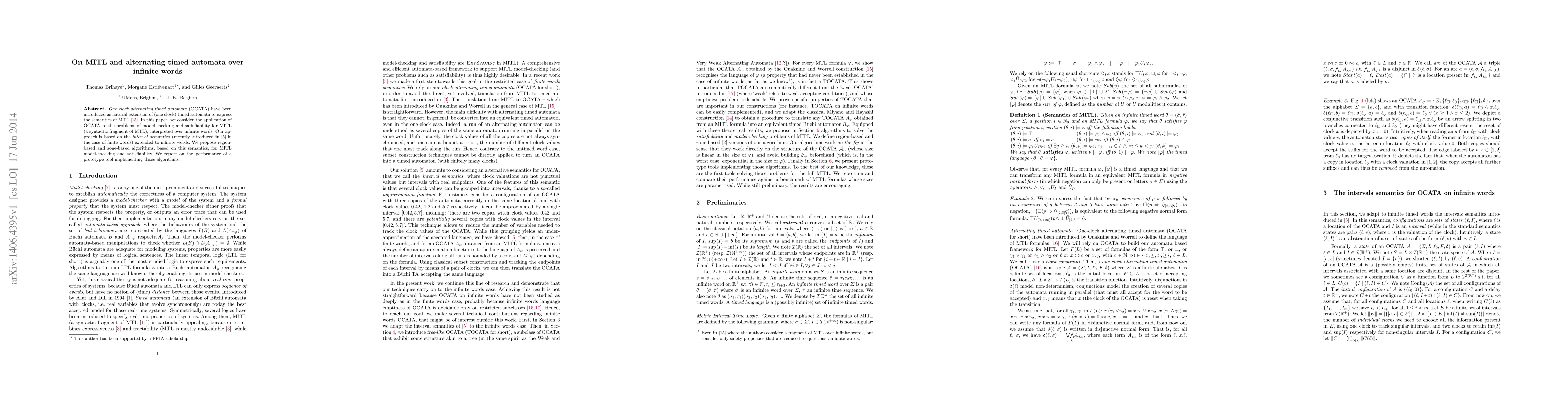 This paper extends the interval semantics of one clock alternating timed automata (OCATA) to infinite words for model-checking and satisfiability of Metric Temporal Logic (MITL). It proposes region-based and zone-based algorithms and reports on the performance of a prototype tool implementing these algorithms.