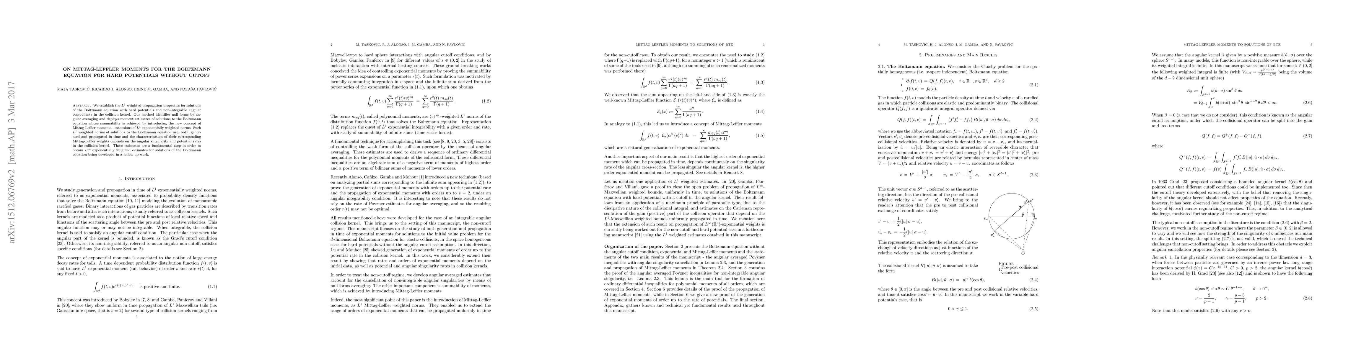 We establish the $L^1$ weighted propagation properties for solutions of the Boltzmann equation with hard potentials and non-integrable angular components in the collision kernel. Our method identifies null forms by angular averaging and deploys moment estimates of solutions to the Boltzmann equation whose summability is achieved by introducing the new concept of Mittag-Leffler moments - extensions of $L^1$ exponentially weighted norms. Such $L^1$ weighted norms of solutions to the Boltzmann equation are, both, generated and propagated in time and the characterization of their corresponding Mittag-Leffler weights depends on the angular singularity and potential rates in the collision kernel. These estimates are a fundamental step in order to obtain $L^\infty$ exponentially weighted estimates for solutions of the Boltzmann equation being developed in a follow up work.