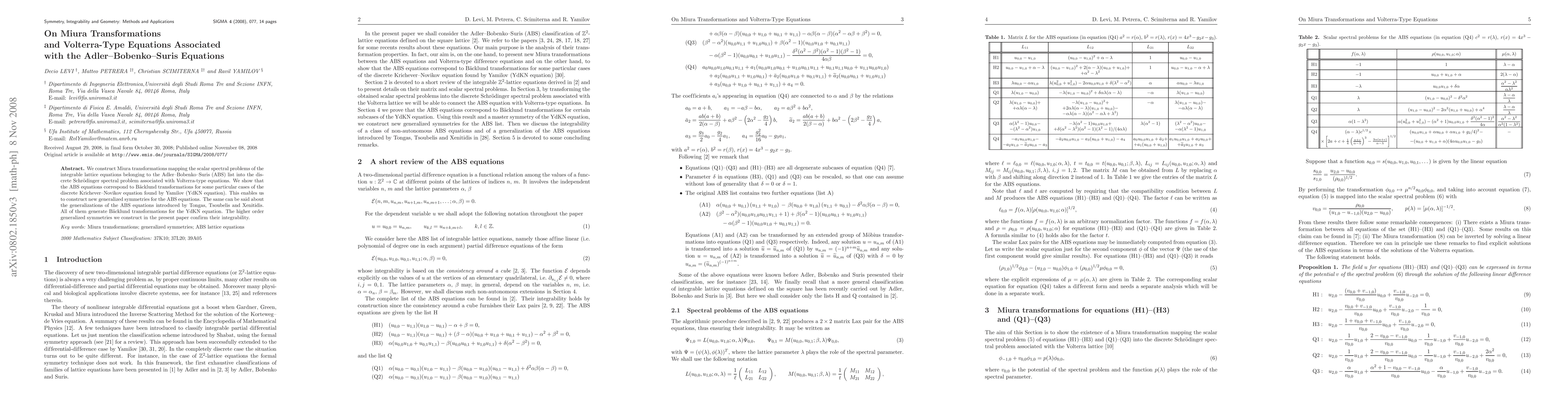 This paper constructs Miura transformations linking scalar spectral problems of integrable lattice equations from the ABS list to the discrete Schrödinger problem associated with Volterra-type equations, thereby establishing new generalized symmetries and confirming the integrability of the ABS equations and their generalizations.