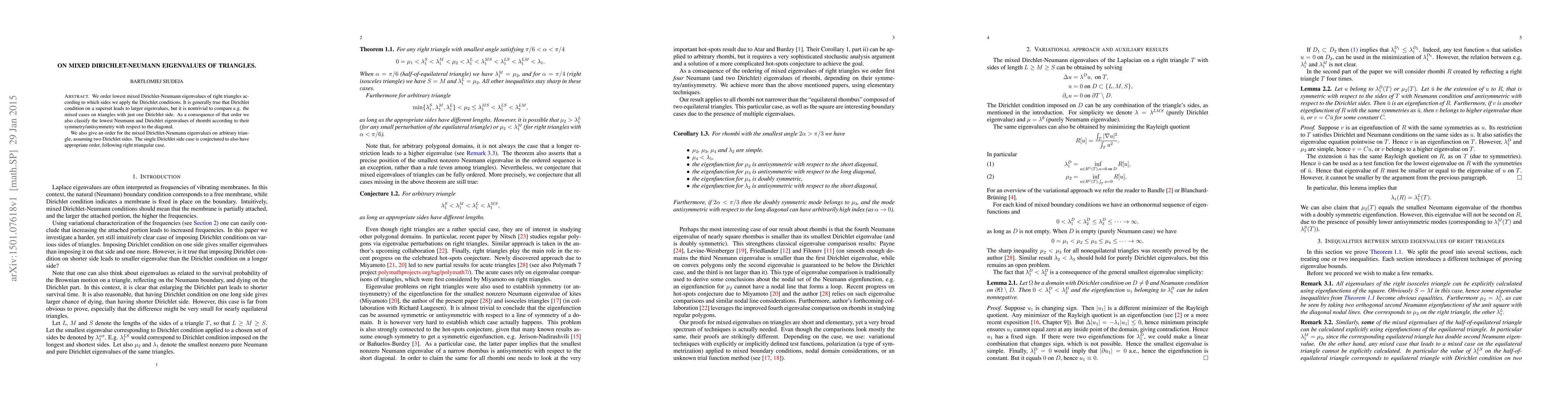 This paper orders the lowest mixed Dirichlet-Neumann eigenvalues of right triangles based on the application of Dirichlet conditions, revealing that larger eigenvalues result from conditions on larger subsets. The study also classifies the lowest Neumann and Dirichlet eigenvalues of rhombi based on their symmetry/antisymmetry relative to the diagonal.
