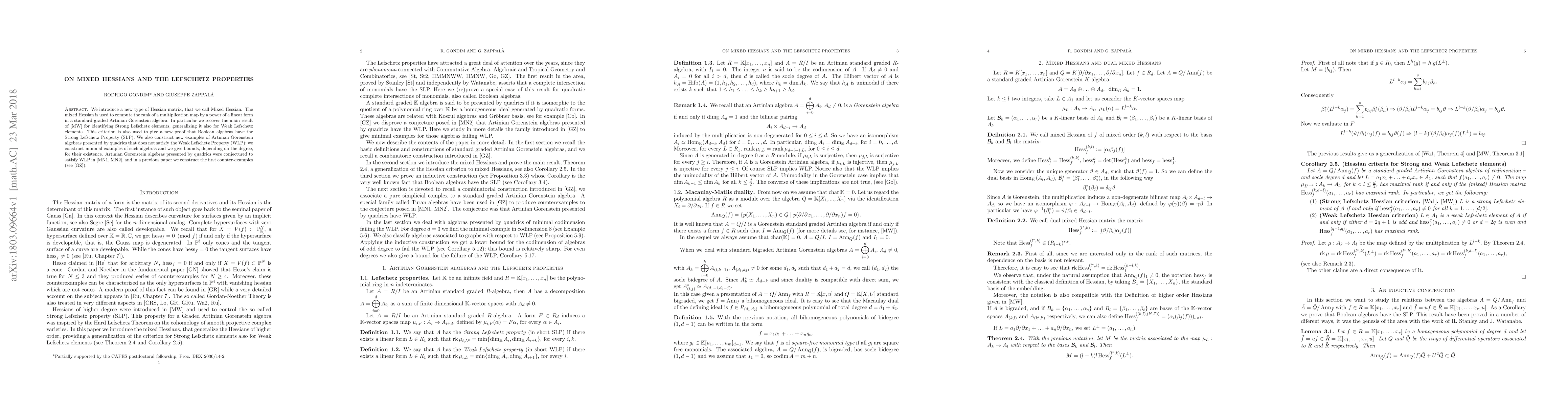 This paper introduces Mixed Hessians to compute ranks in standard graded Artinian Gorenstein algebras, generalizing criteria for Strong and Weak Lefschetz properties. It provides new proofs for Boolean algebras' Strong Lefschetz Property and constructs minimal counter-examples of Artinian Gorenstein algebras presented by quadrics that do not satisfy the Weak Lefschetz Property.