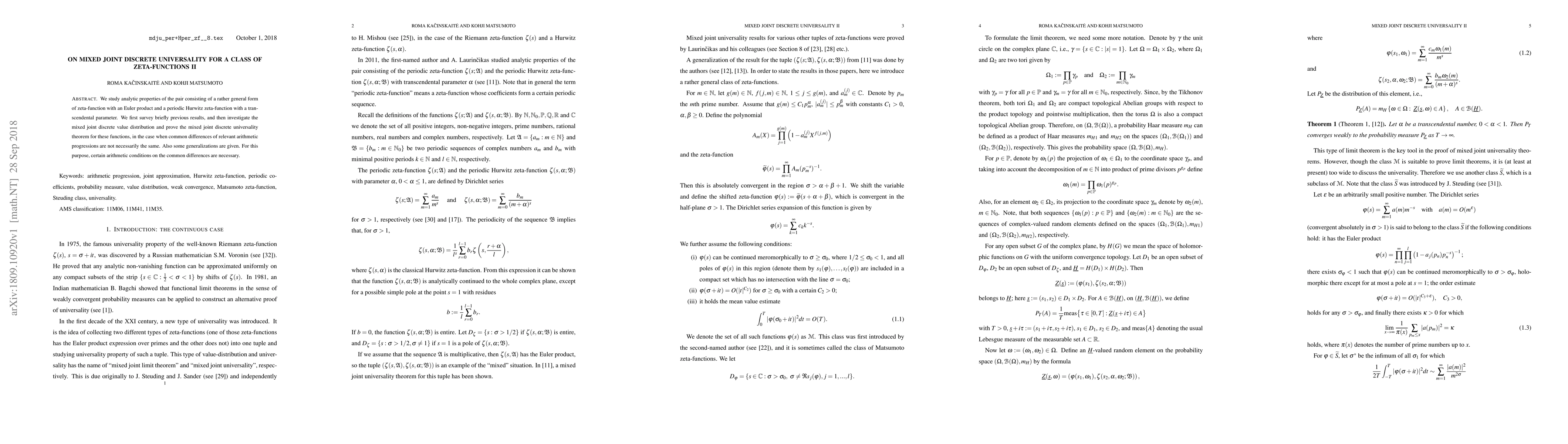 We study analytic properties of the pair consisting of a rather general form of zeta-function with an Euler product and a periodic Hurwitz zeta-function with a transcendental parameter. We first survey briefly previous results, and then investigate the mixed joint discrete value distribution and prove the mixed joint discrete universality theorem for these functions, in the case when common differences of relevant arithmetic progressions are not necessarily the same. Also some generalizations are given. For this purpose, certain arithmetic conditions on the common differences are necessary.