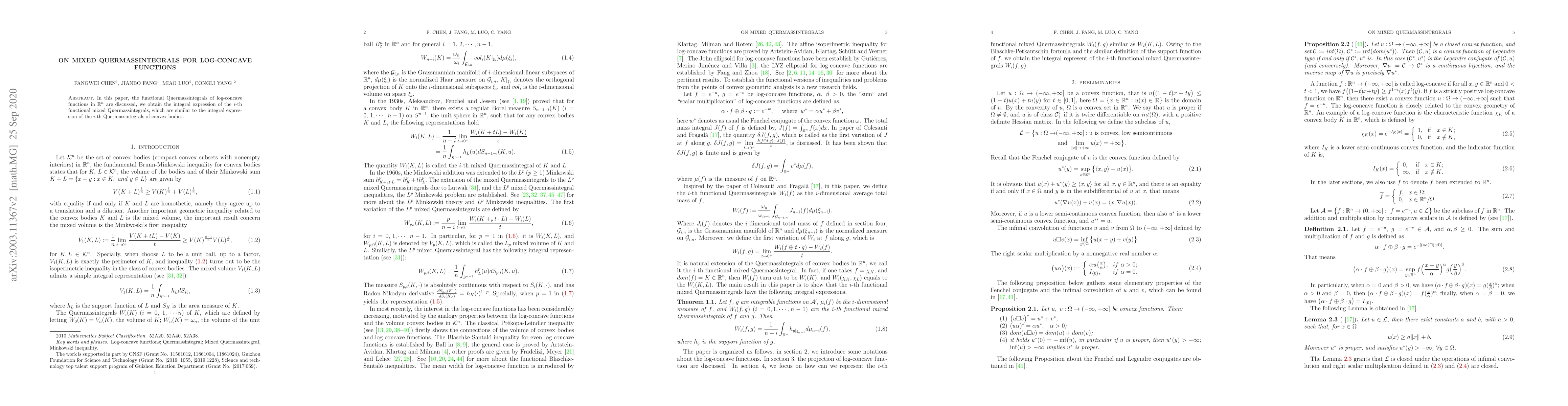 In this paper, the functional Quermassintegrals of log-concave functions in $\mathbb R^n$ are discussed, we obtain the integral expression of the $i$-th functional mixed Quermassintegrals, which are similar to the integral expression of the $i$-th Quermassintegrals of convex bodies.
