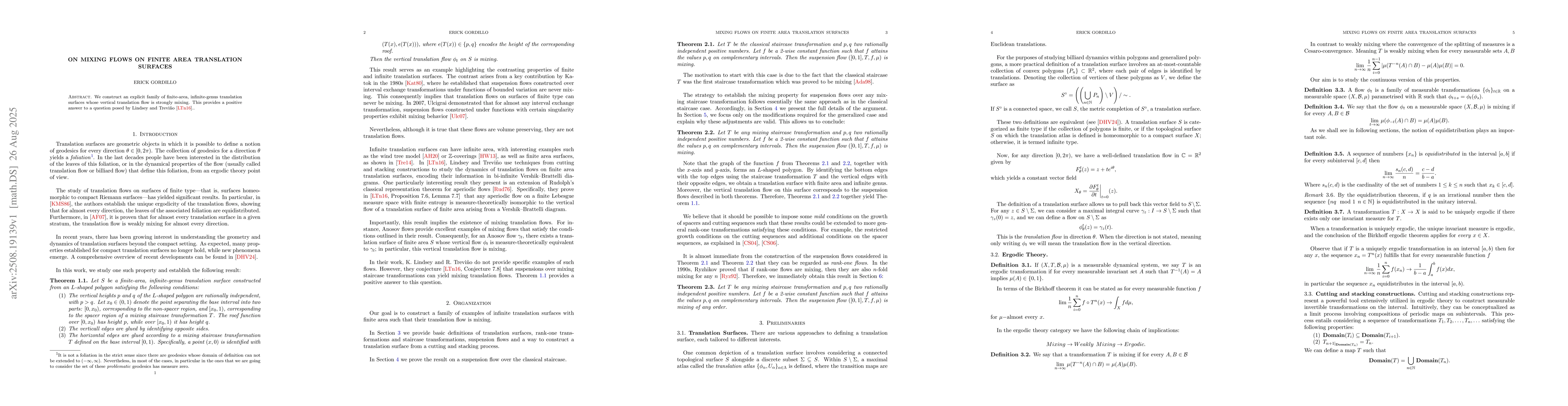We construct an explicit family of finite-area, infinite-genus translation surfaces whose vertical translation flow is strongly mixing. This provides a positive answer to a question posed by Lindsey and Trevi\~no~\cite{LT}