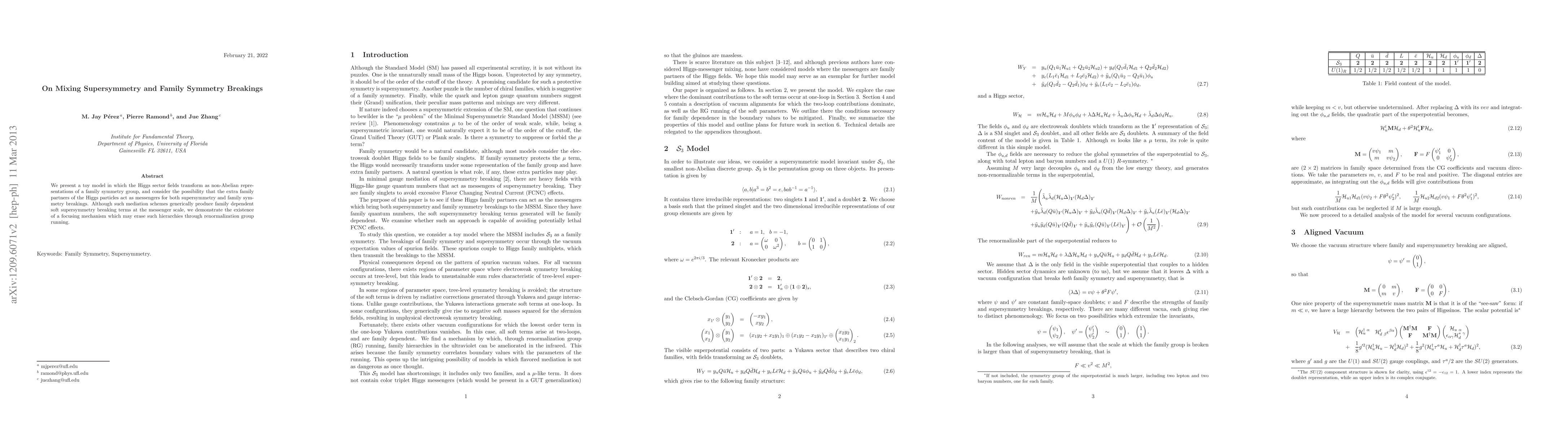 This paper proposes a toy model where Higgs sector fields represent non-Abelian family symmetry group transformations. It explores the idea that extra Higgs partners could mediate both supersymmetry and family symmetry breakings, despite typically generating family-dependent soft supersymmetry breaking terms. The model introduces a 'focusing mechanism' to erase these hierarchies via renormalization group running.