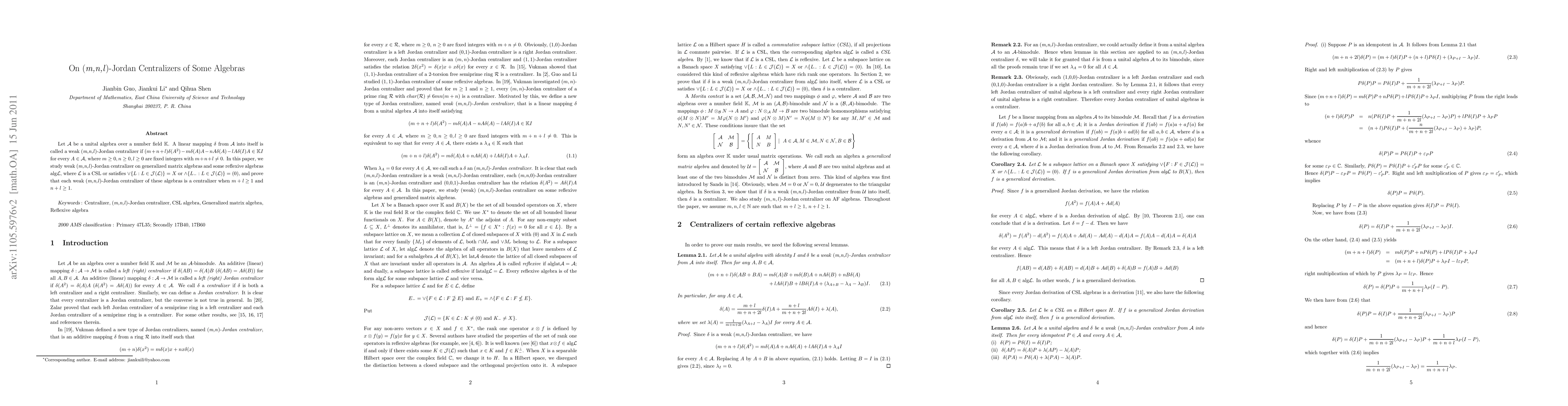 This paper investigates weak (m,n,l)-Jordan centralizers in generalized matrix algebras and reflexive algebras, proving that such centralizers are centralizers when certain conditions on m, n, and l are met. The study focuses on algebras where specific structural properties hold.