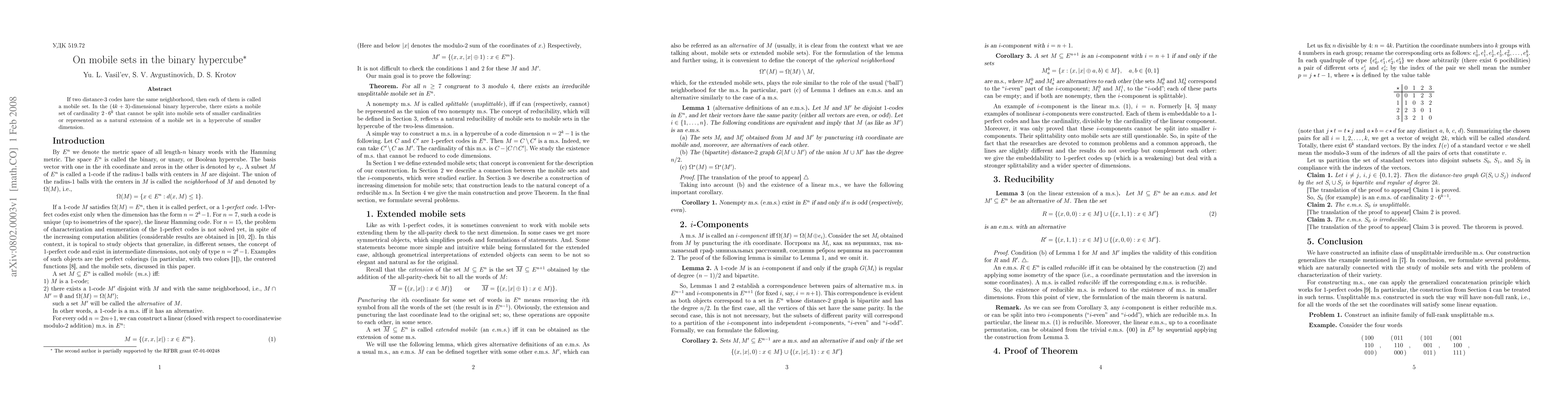 If two distance-3 codes have the same neighborhood, then each of them is called a mobile set. In the (4k+3)-dimensional binary hypercube, there exists a mobile set of cardinality 2*6^k that cannot be split into mobile sets of smaller cardinalities or represented as a natural extension of a mobile set in a hypercube of smaller dimension. Keywords: mobile set; 1-perfect code.