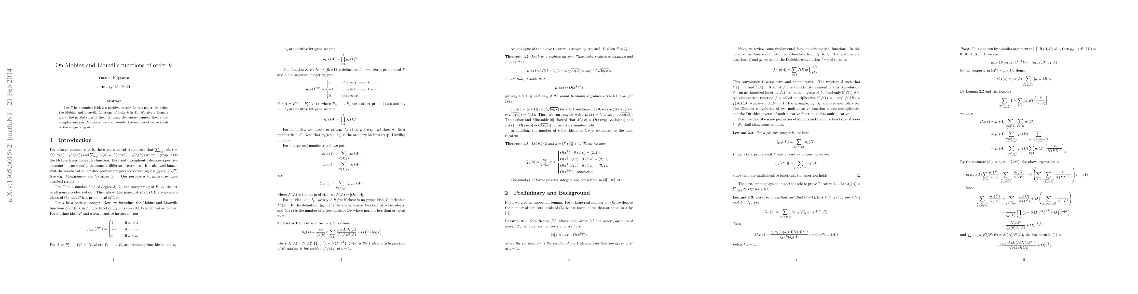 Let $F$ be a number field, $k$ a positive integer. In this paper, we define the Mobius and Liouville functions of order $k$ in $F$. We give a formula about the partial sums of them by using elementary number theory and complex analysis. Moreover, we also consider the number of $k$-free ideals of the integer ring of $F$.