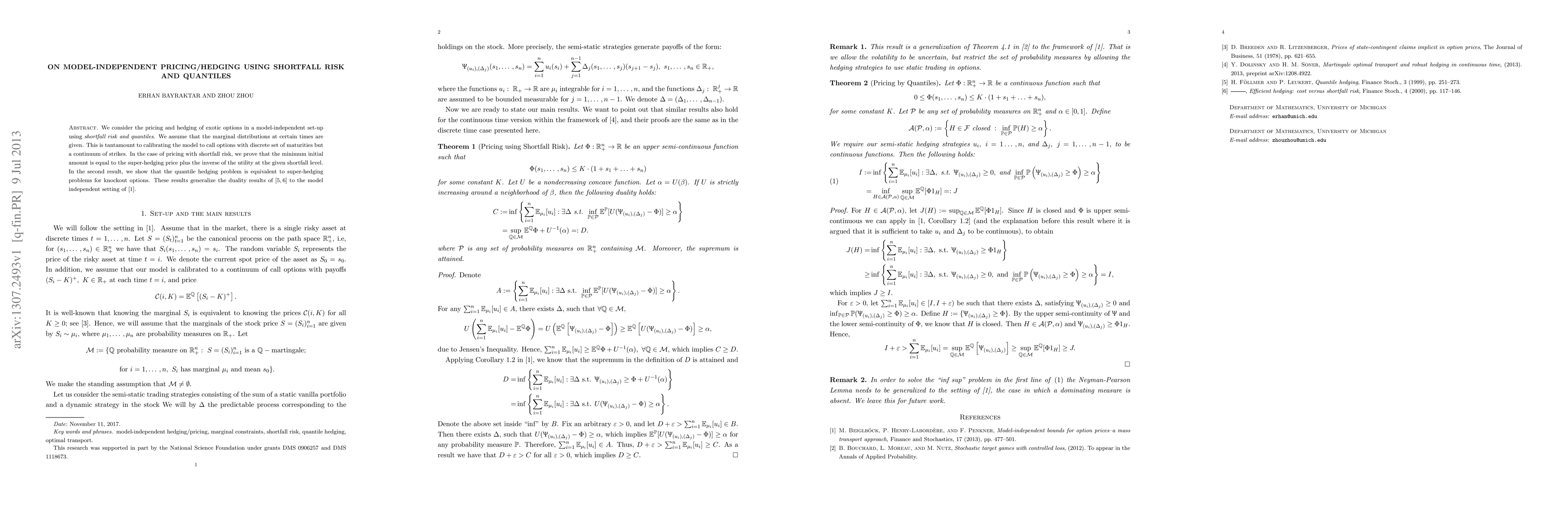 This paper proposes a model-independent approach for pricing and hedging exotic options using shortfall risk and quantiles. It establishes that the minimum initial amount for pricing with shortfall risk equals the super-hedging price plus the inverse utility at the given shortfall level, and equates the quantile hedging problem to super-hedging problems for knockout options.