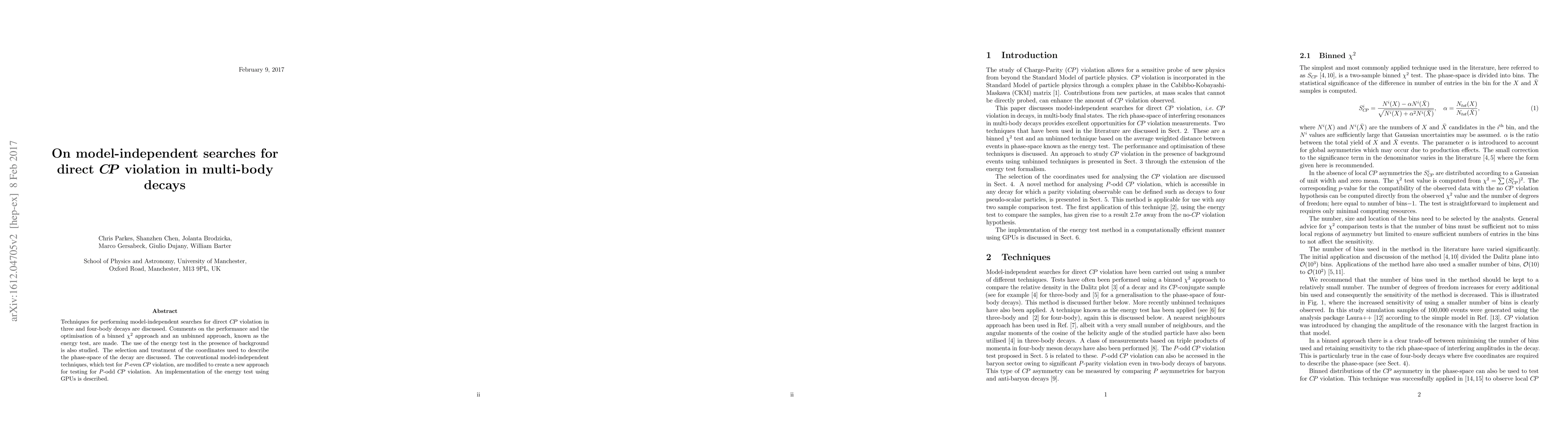 This paper discusses methods for model-independent searches for direct CP violation in multi-body decays, comparing binned chi-square and energy test approaches. It introduces a new approach for testing P-odd CP violation and explores the use of GPUs for implementing the energy test.