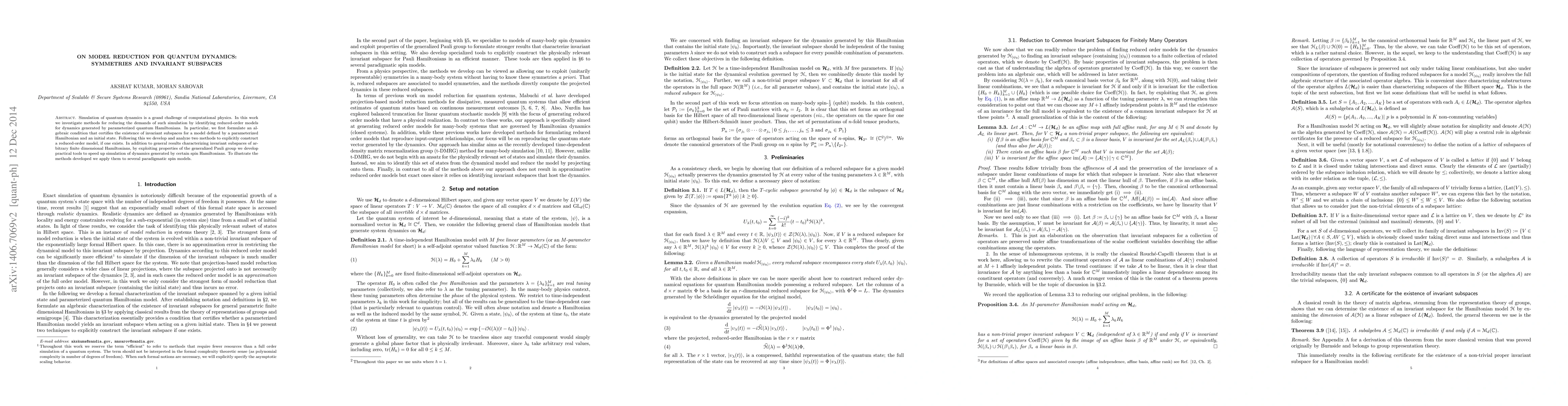 Simulation of quantum dynamics is a grand challenge of computational physics. In this work we investigate methods for reducing the demands of such simulation by identifying reduced-order models for dynamics generated by parameterized quantum Hamiltonians. In particular, we first formulate an algebraic condition that certifies the existence of invariant subspaces for a model defined by a parameterized Hamiltonian and an initial state. Following this we develop and analyze two methods to explicitly construct a reduced-order model, if one exists. In addition to general results characterizing invariant subspaces of arbitrary finite dimensional Hamiltonians, by exploiting properties of the generalized Pauli group we develop practical tools to speed up simulation of dynamics generated by certain spin Hamiltonians. To illustrate the methods developed we apply them to several paradigmatic spin models.
