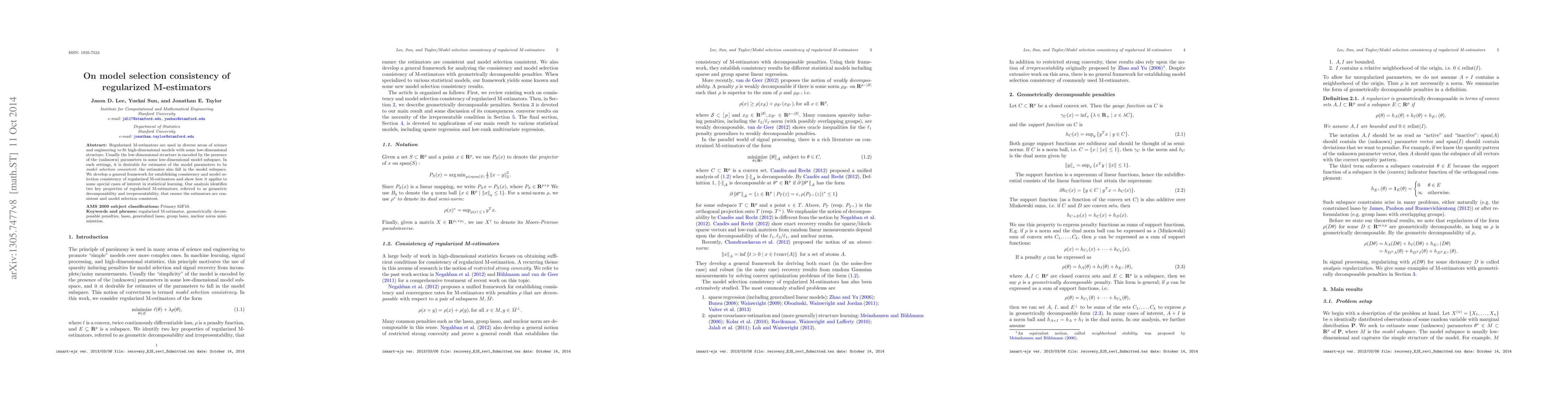 This paper develops a framework for proving consistency and model selection consistency of regularized M-estimators in high-dimensional settings, identifying geometric decomposability and irrepresentability as key properties ensuring these desirable outcomes. The framework is demonstrated through specific applications in statistical learning.
