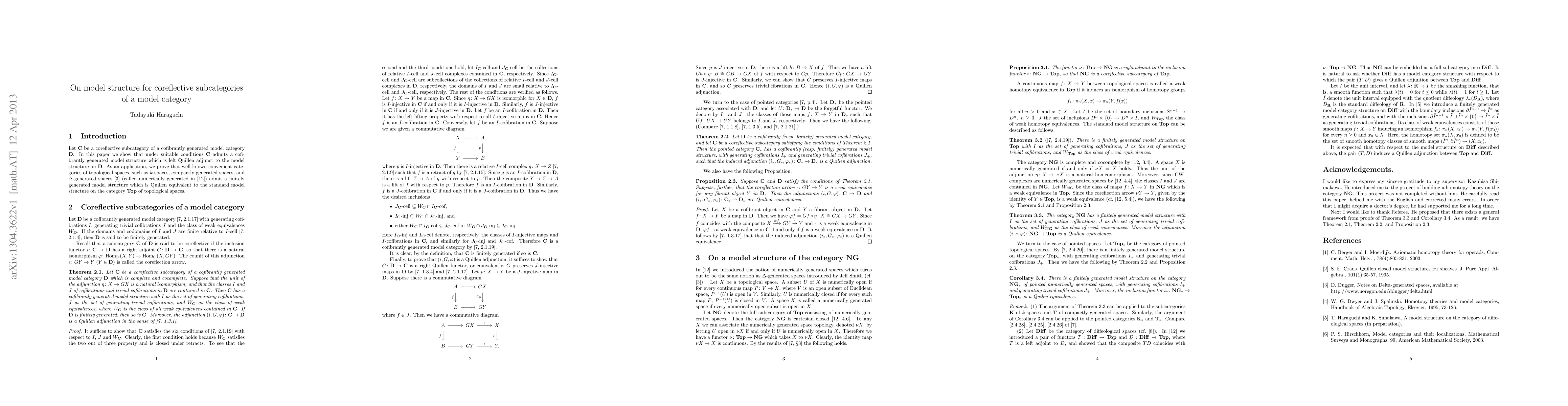 This paper establishes that coreflective subcategories of cofibrantly generated model categories can be endowed with a cofibrantly generated model structure that is left Quillen adjoint to the original category's structure. As an application, it demonstrates that several well-known categories of topological spaces have a finitely generated model structure equivalent to the standard model structure on topological spaces.